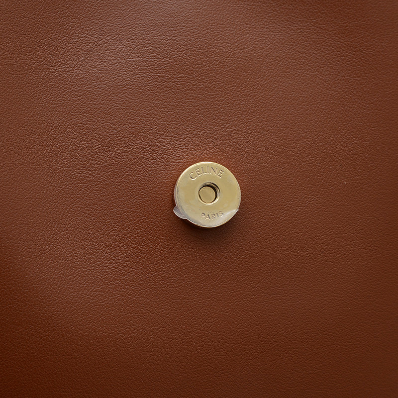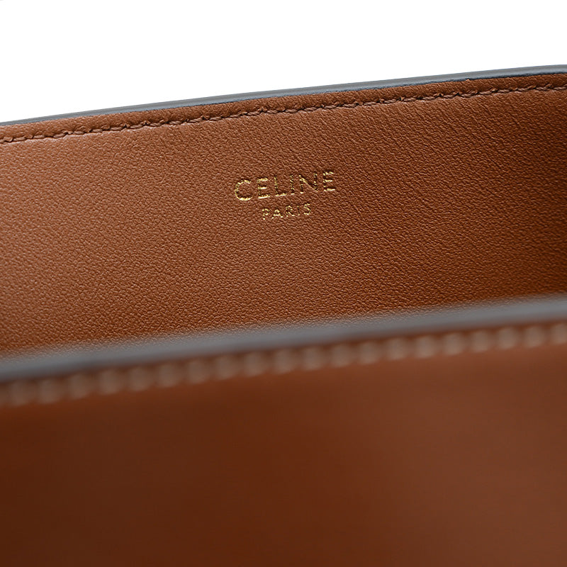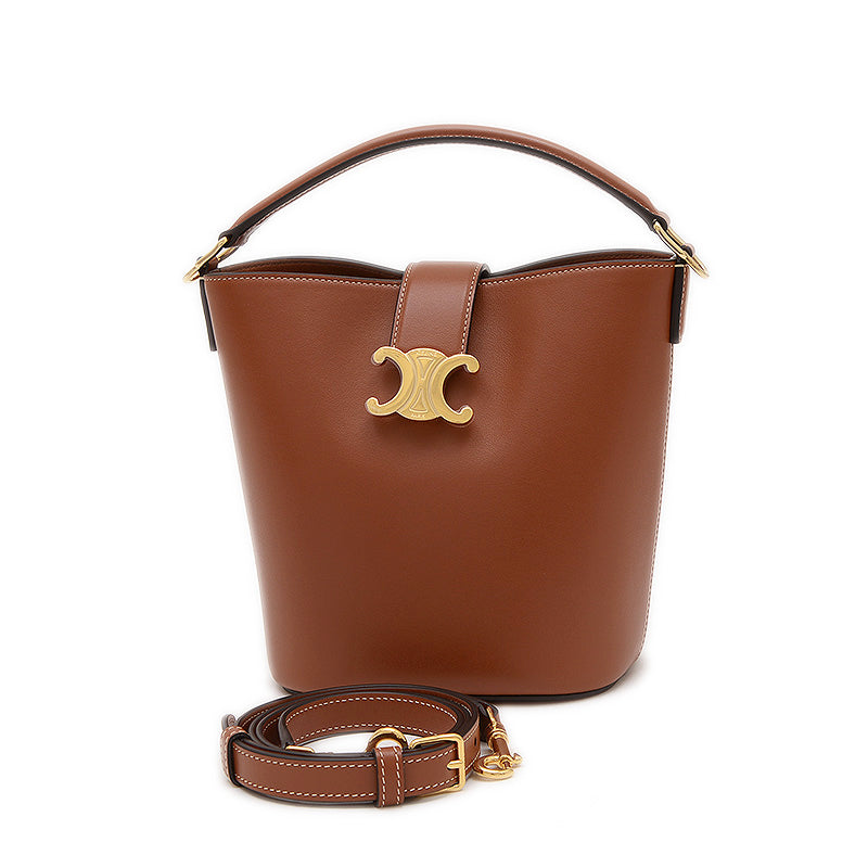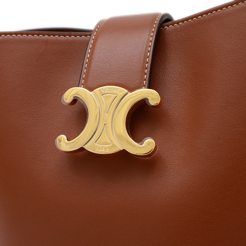 上質なカーフスキンの落ち着いたタンカラーと、丸みを帯びたバケットフォルムが特徴的なバッグです。ゴールドトーンの「CELINE」ロゴがさりげなく上品なアクセントになっています。取り外し可能なショルダーストラップにより、ハンドバッグとしてもクロスボディとしても楽しめる、機能的かつエレガントな逸品です。