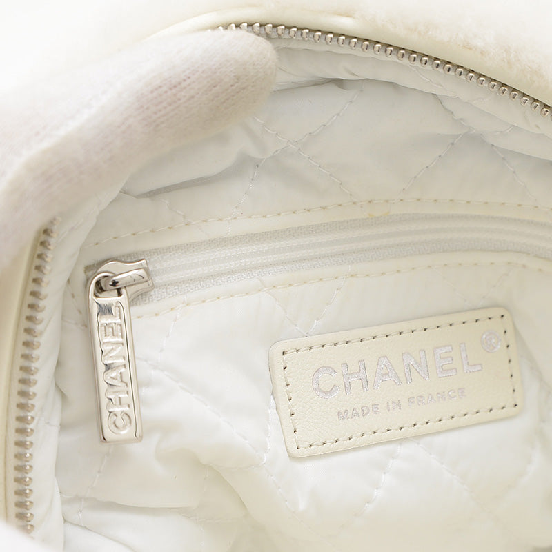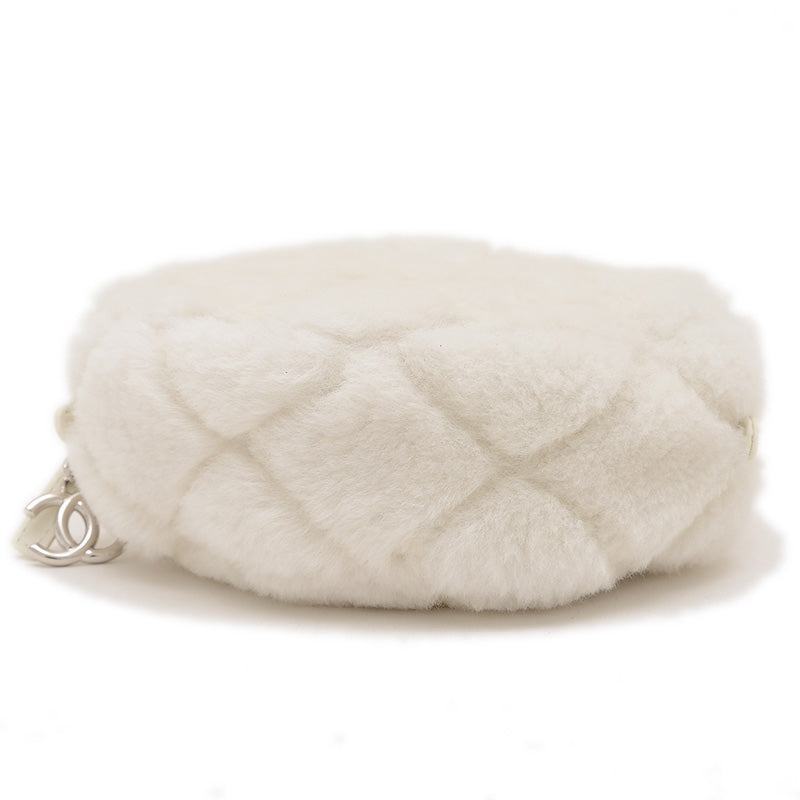 ふんわりとした柔らかなシアリング(ムートン)素材のホワイトが愛らしい、丸いフォルムのショルダーバッグです。大胆なココマークが中央に配され、シルバー金具のチェーンストラップがクールなアクセントになっています。コンパクトながらも存在感があり、冬の装いに温かみと遊び心を添える、個性的なシャネルの逸品です。