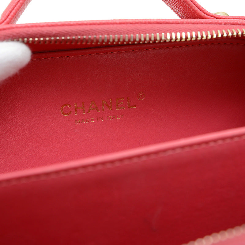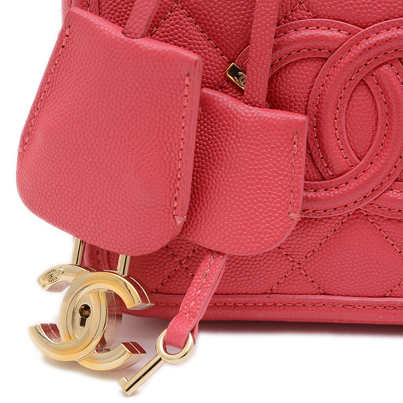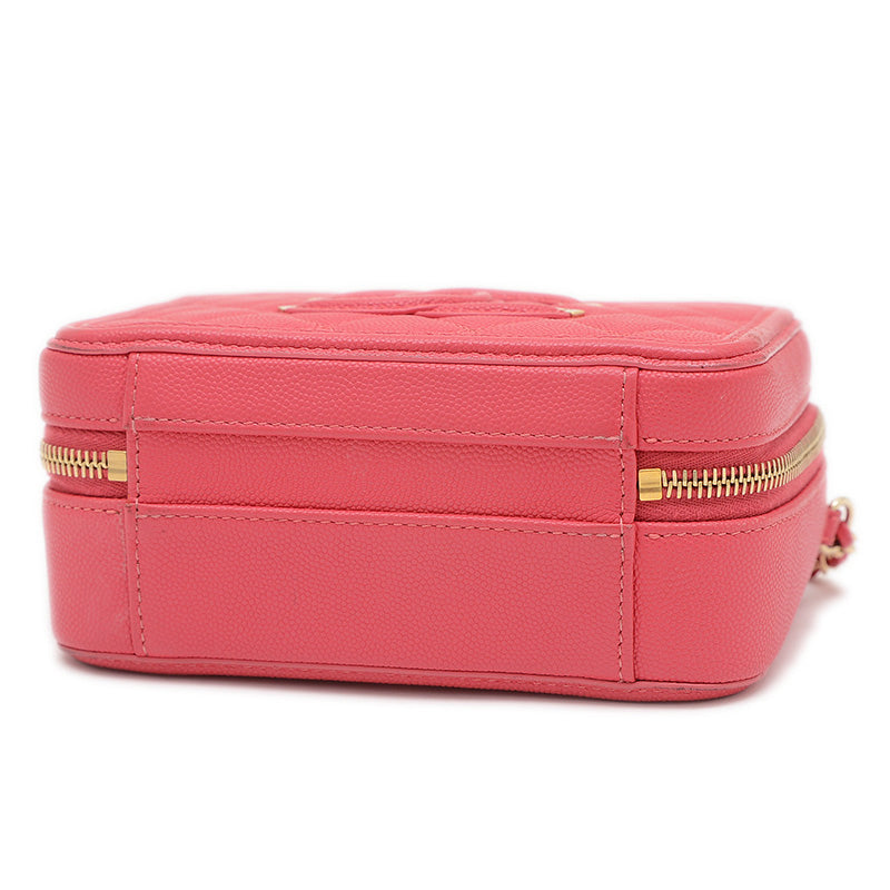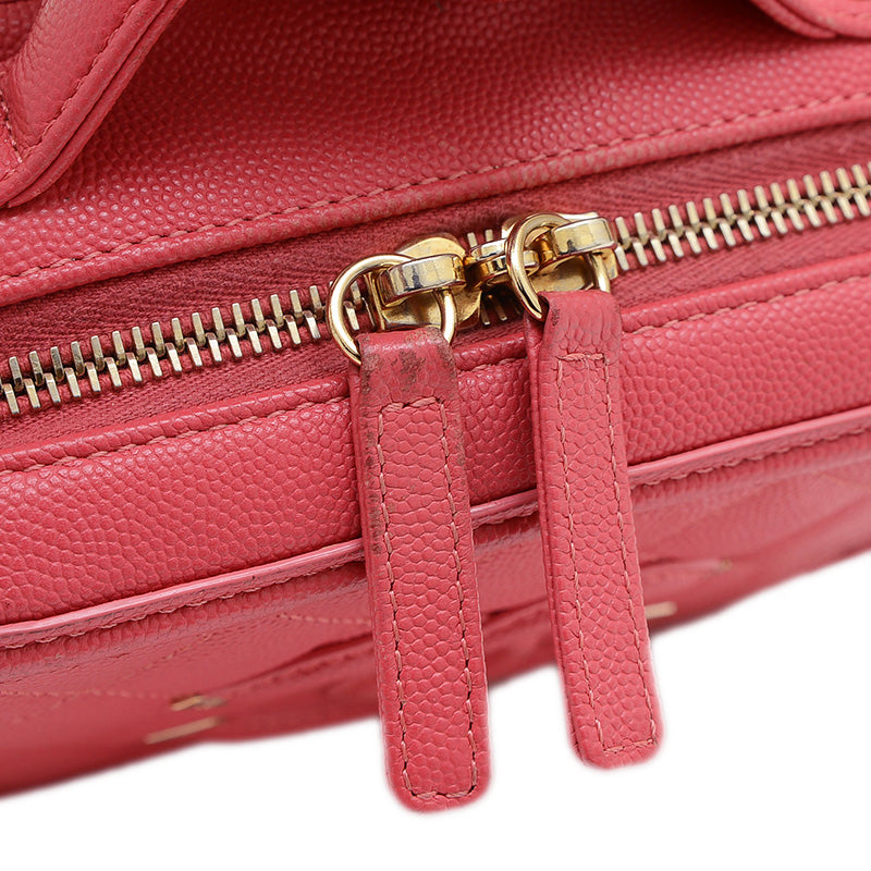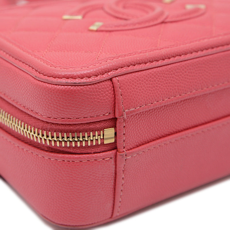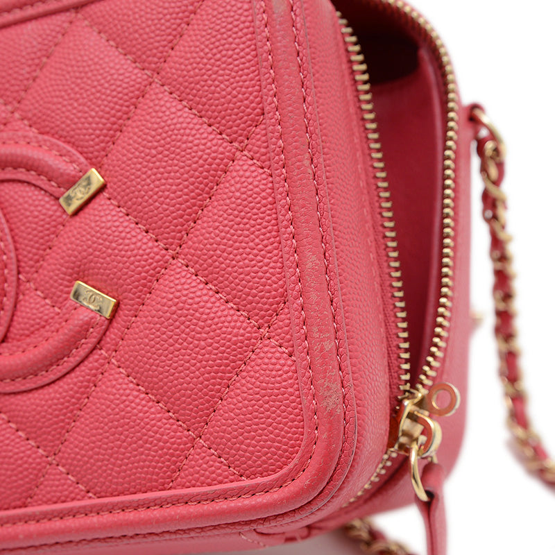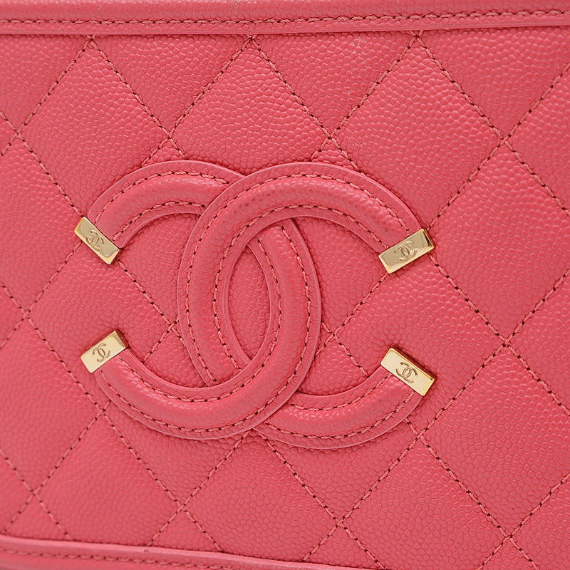 ふっくらとしたマトラッセステッチが施された、傷に強いキャビアスキン素材のバニティバッグです。愛らしいピンクカラーに、ゴールドまたはシルバーのフィリグリー(繊細な装飾)が施されたCCロゴが際立ち、トップハンドルとチェーンストラップで2WAYの持ち方が楽しめます。コンパクトながらも収納力を備え、日常から特別な日まで活躍する、エレガントで機能的な逸品です。