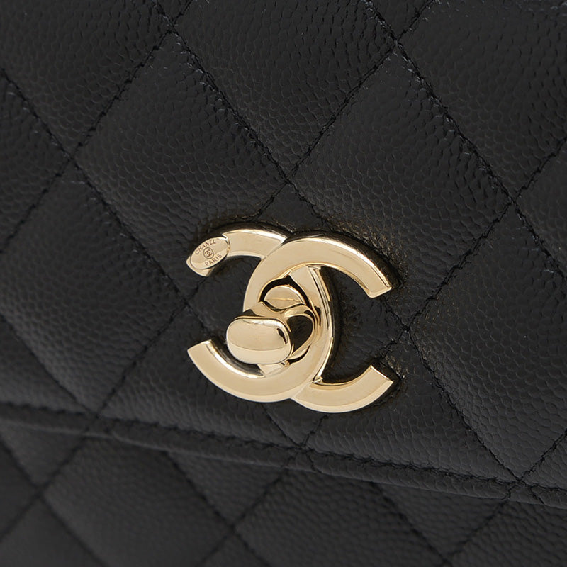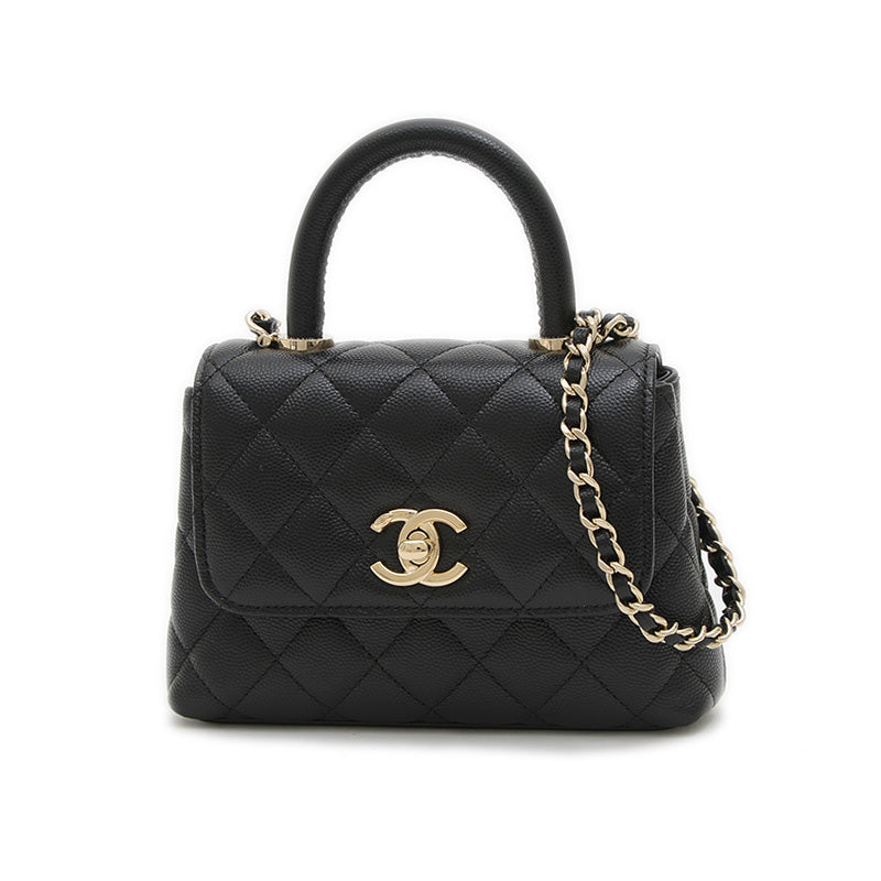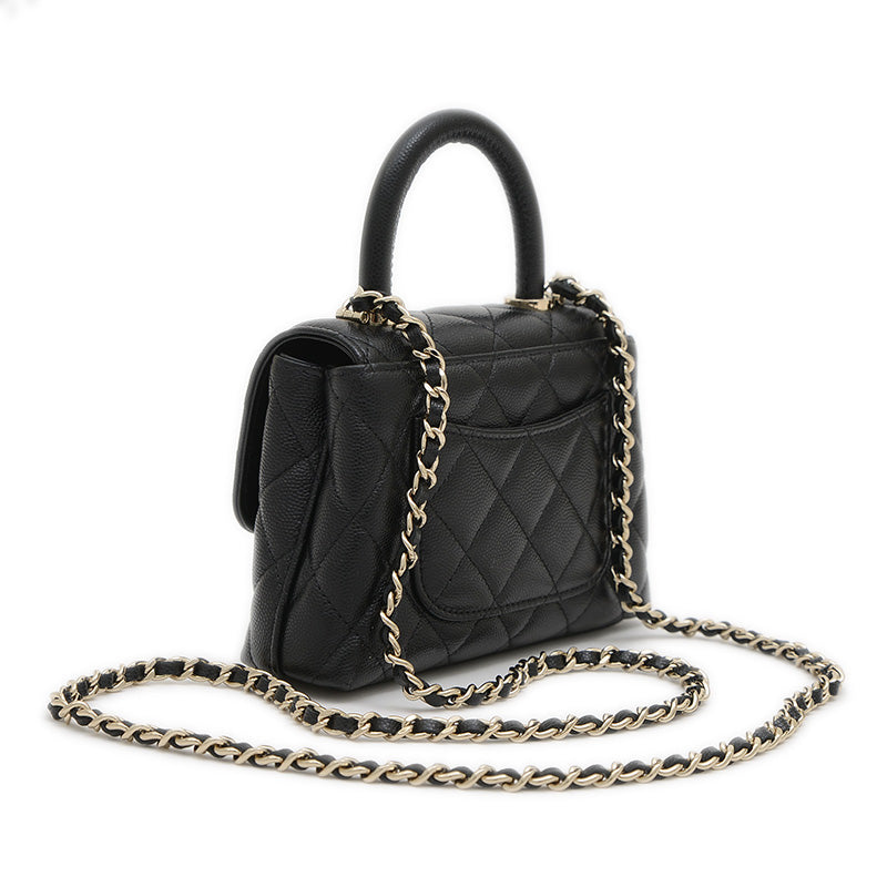 その名の通り、非常にコンパクトで愛らしいエクストラミニサイズのココハンドルです。傷に強いキャビアスキン素材のブラックに、上品なゴールド金具が組み合わされ、トップハンドルとチェーンストラップで2WAYの持ち方が楽しめます。小ぶりながらもココハンドルのエレガントな魅力を凝縮した、パーティーシーンやちょっとしたお出かけに最適な逸品です。