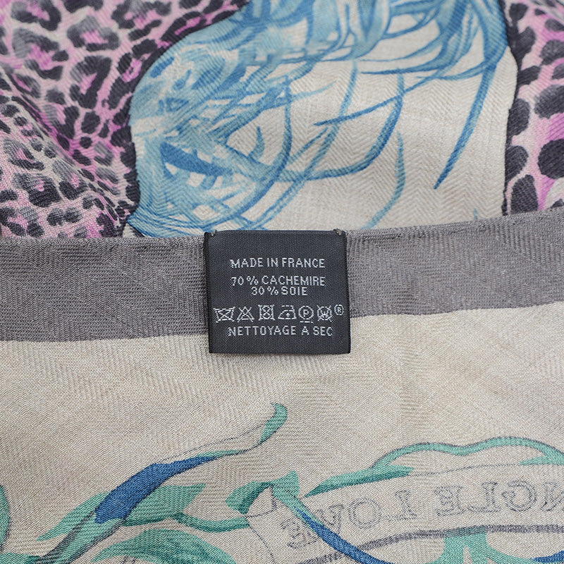 カシミヤとシルクの混合素材が織りなす、しなやかな肌触りの大判トライアングルショールです。メゾンを象徴する動物モチーフの中でも特に人気の高い「JUNGLE LOVE」の柄が、色彩豊かに描かれています。独特の三角形のフォルムは、首元に巻いたり、肩にかけたりと、様々なアレンジを楽しめ、装いにエレガントな遊び心と華やかさを添える逸品です。