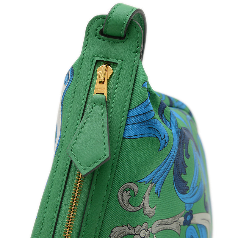 軽量なシルク素材と上質なスイフトレザーを組み合わせた、コンパクトなショルダーバッグです。鮮やかなグリーンとブルーを基調としたシルクには、エルメスらしい繊細なパターンが描かれており、バッグの開口部にレザーのフラップが上品なアクセントになっています。日常の必需品をスマートに収納でき、持つだけで装いに華やかさと洗練された印象を添える人気の逸品です。
