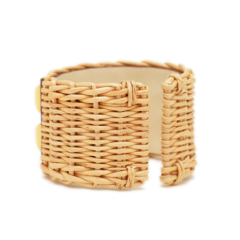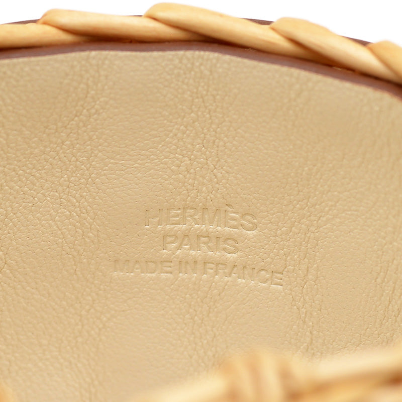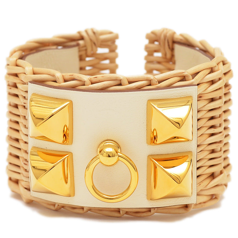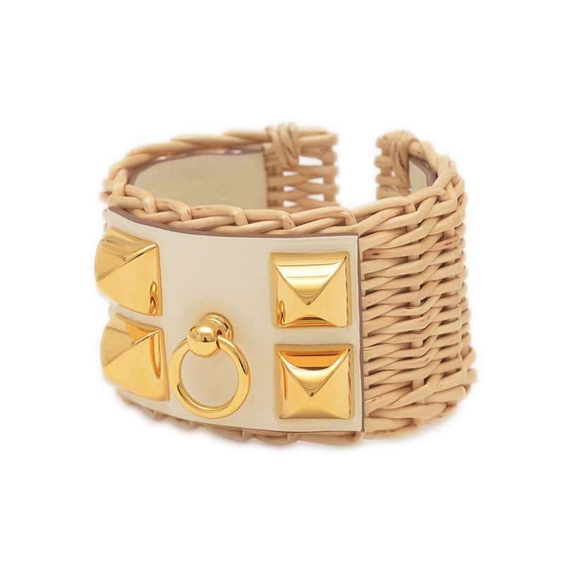 - スタッズとメドールクラスプが特徴的なブレスレットに、天然素材である柳(ウィッカー)を組み合わせたユニークなデザインです。上質なスイフトレザーのナタ(オフホワイト)カラーに、ゴールド金具が上品なアクセントになっています。カジュアルな中にエルメスらしいエレガンスが光り、手元に洗練された遊び心を添えます。