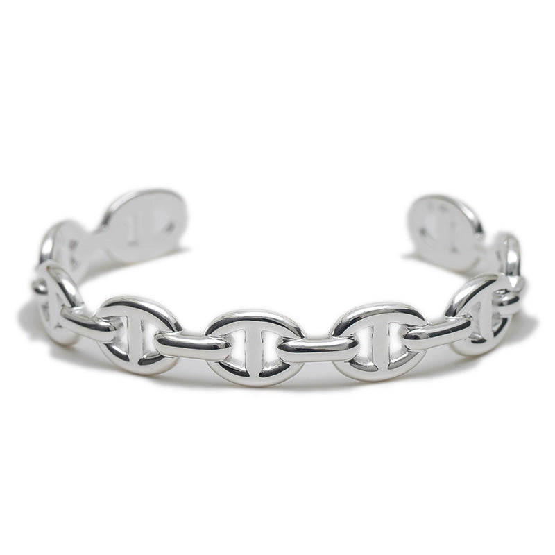 - ブランドを象徴する錨の鎖「シェーヌダンクル」モチーフを、より洗練された一体型のフォルムで表現したバングルです。上質なシルバー925素材が洗練された輝きを放ち、手首にモダンで存在感のあるアクセントを添えます。シンプルでありながら力強い個性を主張し、日常使いから特別な日まで幅広く活躍する、タイムレスな魅力を持つ逸品です。