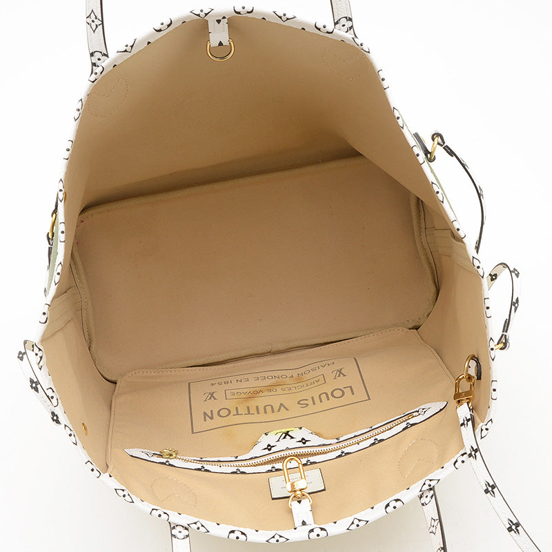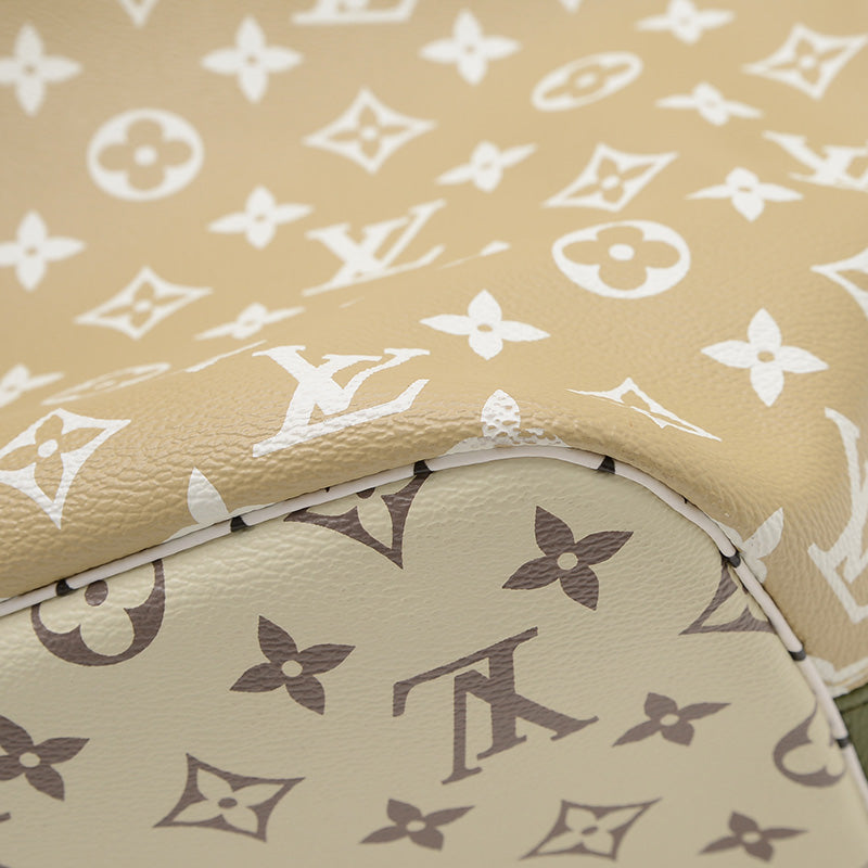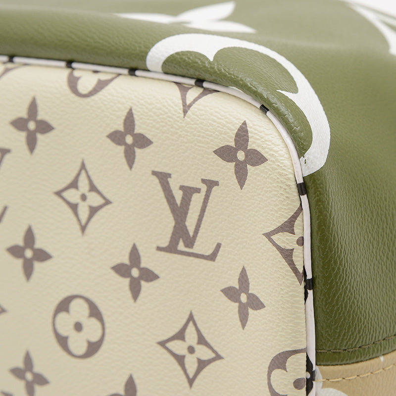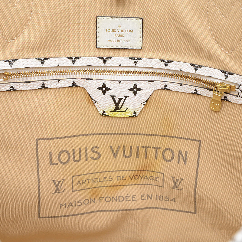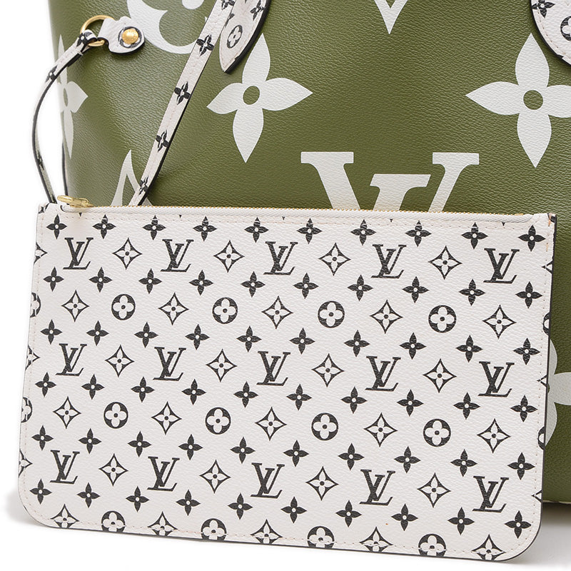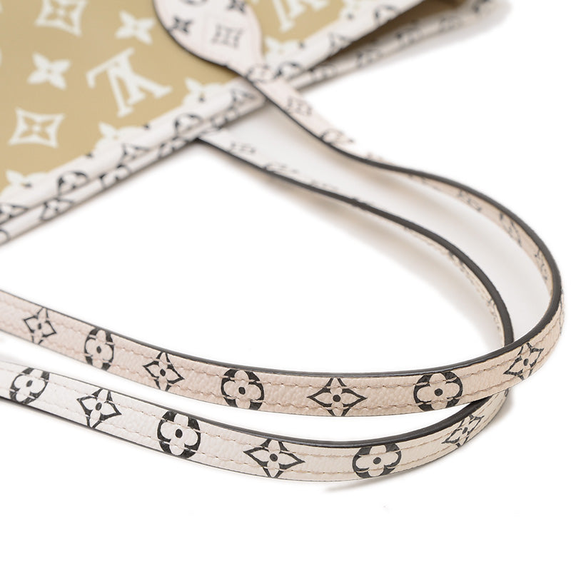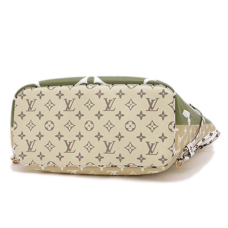 - 2019年春夏限定の「モノグラム・ジャイアント」コレクションの一部として登場したトートバッグです。カーキ、クレーム、ホワイトの3色を組み合わせた大胆な配色と、オーバーサイズのモノグラム柄が特徴で、クラシックなデザインにモダンなエッセンスを加えています。付