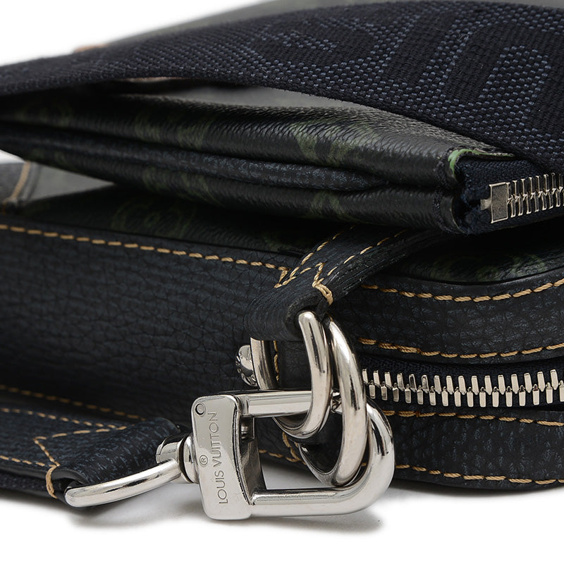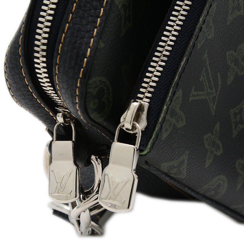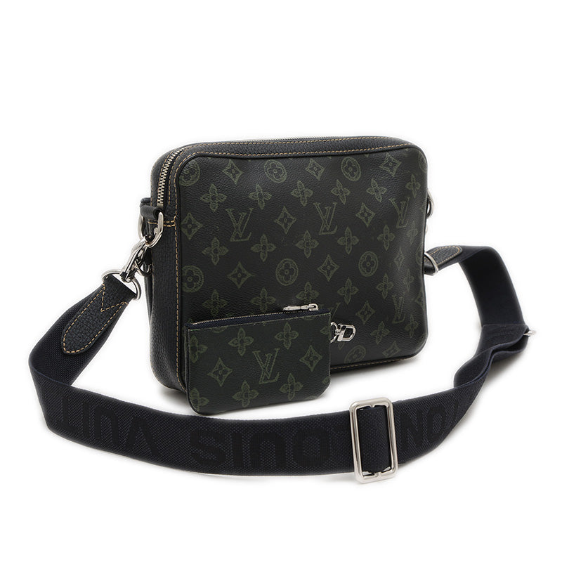 グリーンのモノグラムキャンバスにダークな背景を組み合わせたハイブリッドショルダーバッグで、前面に取り外し可能なジップポケットと小銭入れを備え、メイン収納+フラットポケット付き、調節可能ストラップで斜め掛けも快適な実用デザインが魅力です。