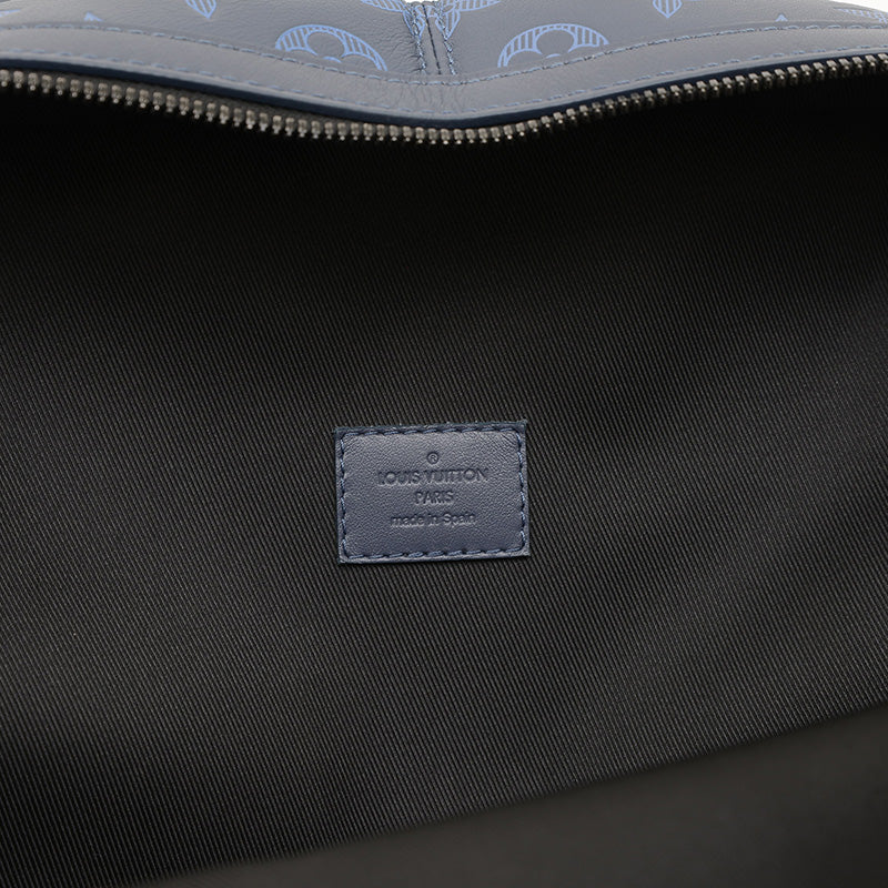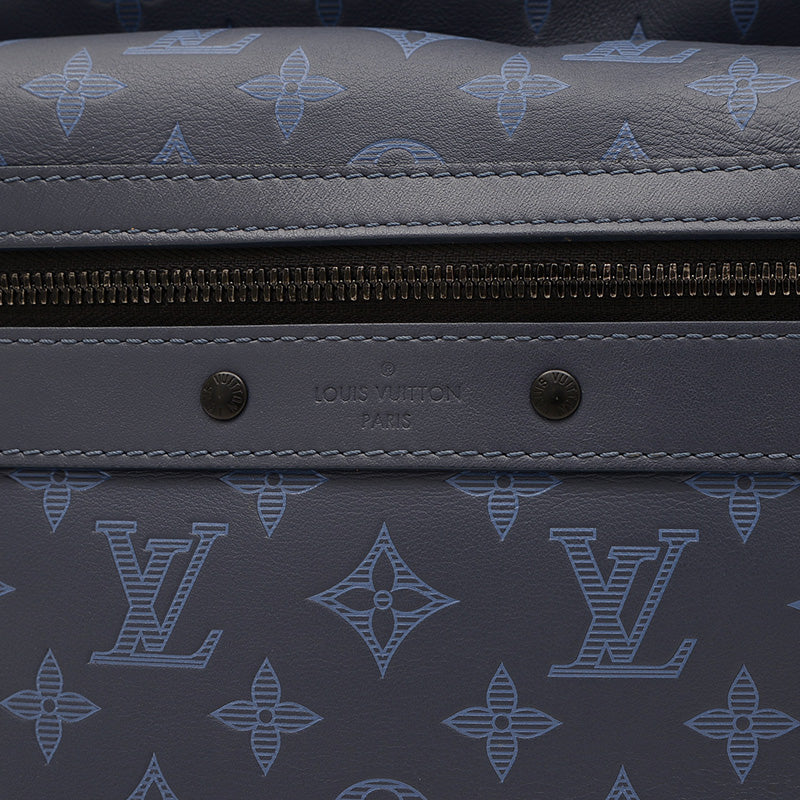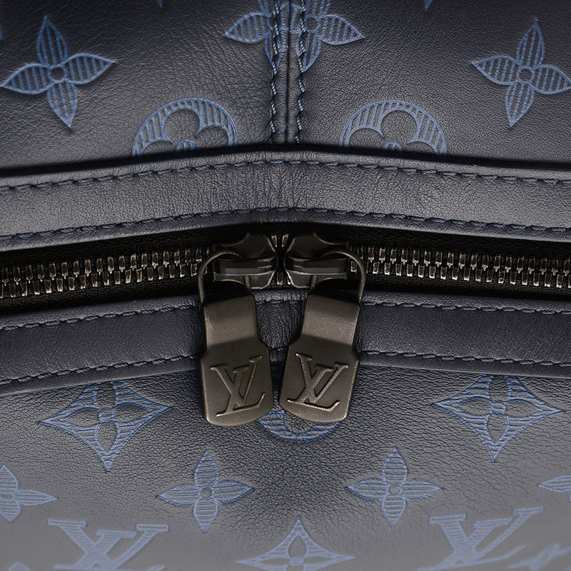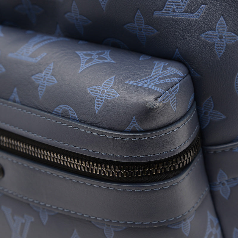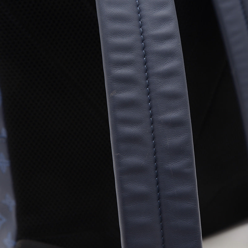 ネイビーブルーのモノグラム・シャドウレザーにブラック金具を組み合わせた洗練されたデザインで、Wファスナー開閉・外ファスナーポケット・内フラットポケット×3を備え、A4対応の収納力と背負いやすさを両立する実用的かつ上品な逸品です。