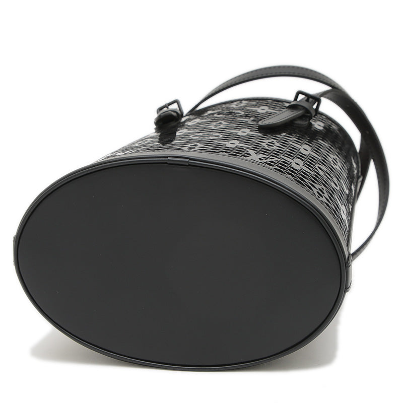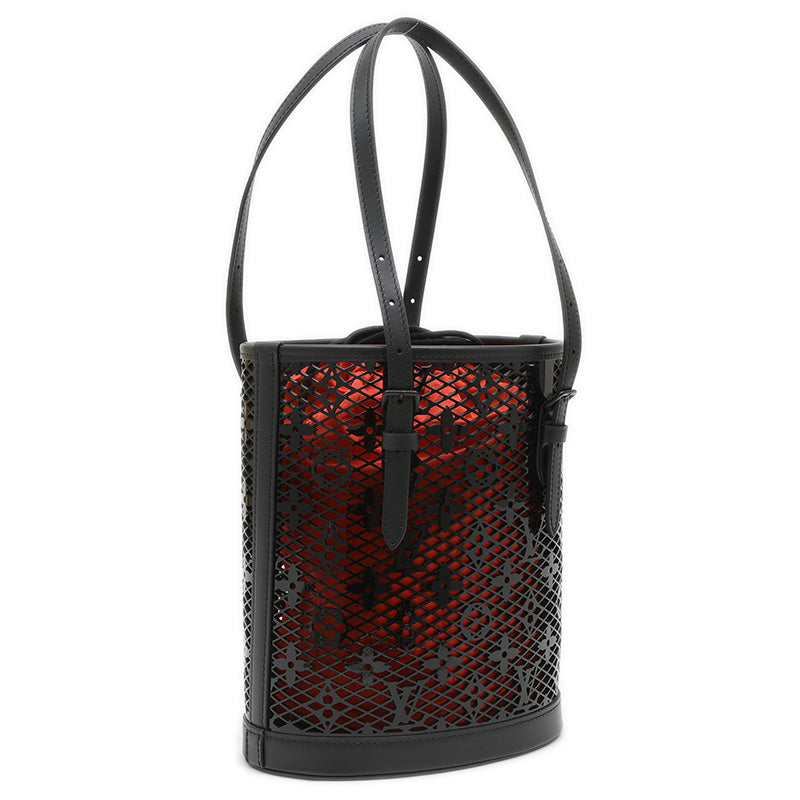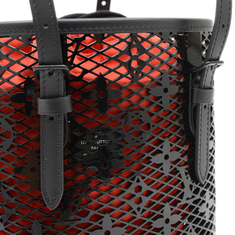 光沢のあるパテントレザーのブラックに、モノグラム・パターンがレースのように繊細に描かれた、フェミニンなハンドバッグです。開口部の鮮やかなレッドカラーがアクセントとなり、コンパクトなPMサイズながらもバケット型で収納力があります。取り外し可能なショルダーストラップ付きで、手持ちとしてもクロスボディとしても楽しめる、エレガントで個性的な逸品です。