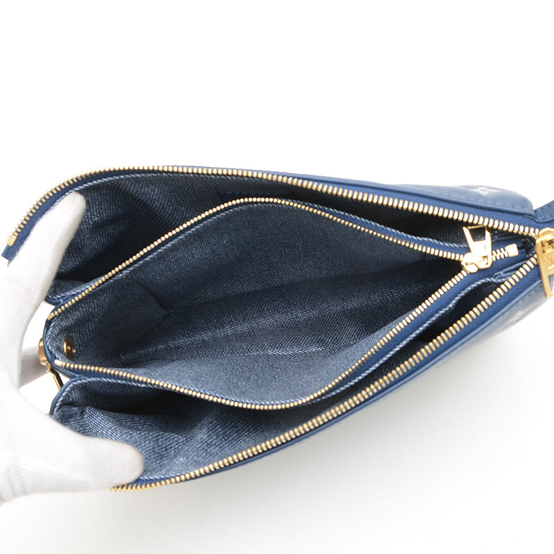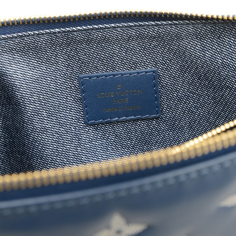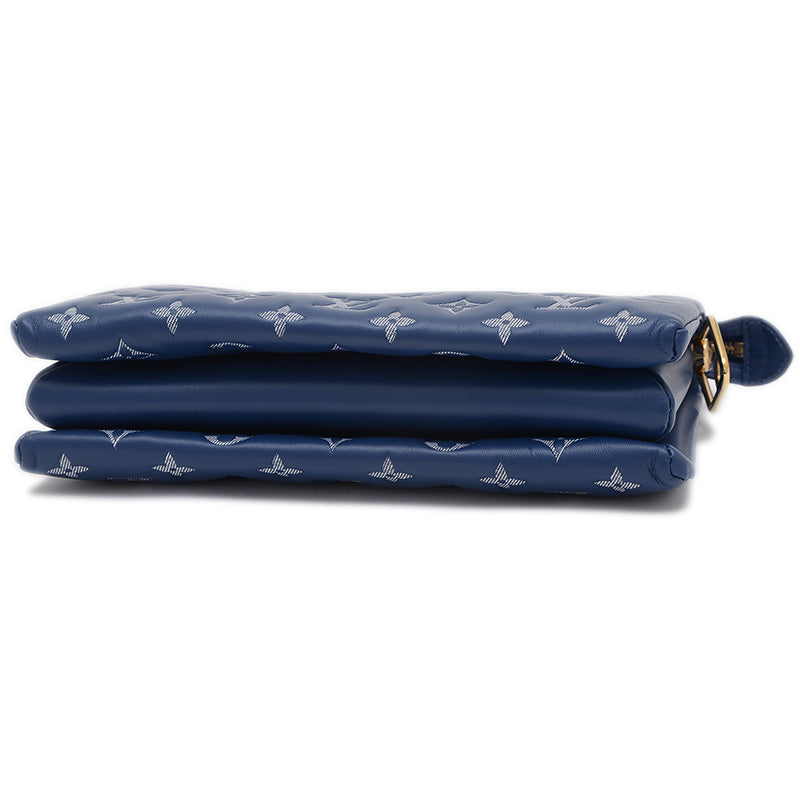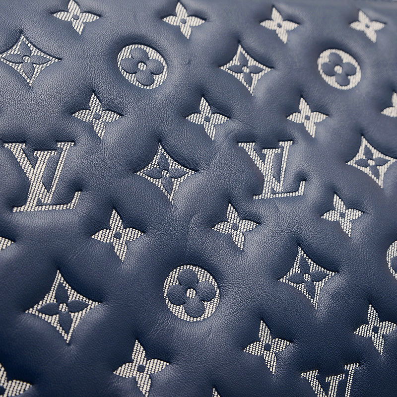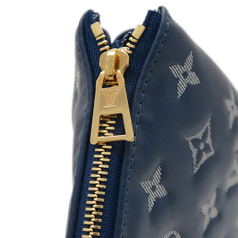 - ふっくらとした柔らかなレザーにモノグラム・パターンがエンボス加工された、クッションのようなデザインが特徴の2WAYバッグです。深みのあるネイビーブルーカラーがシックな印象を与え、チェーンストラップがエレガントなアクセントになっています。コンパクトながらも日常の必需品を収納でき、ショルダーやクロスボディと多様なスタイルを楽しめる人気の逸品です。