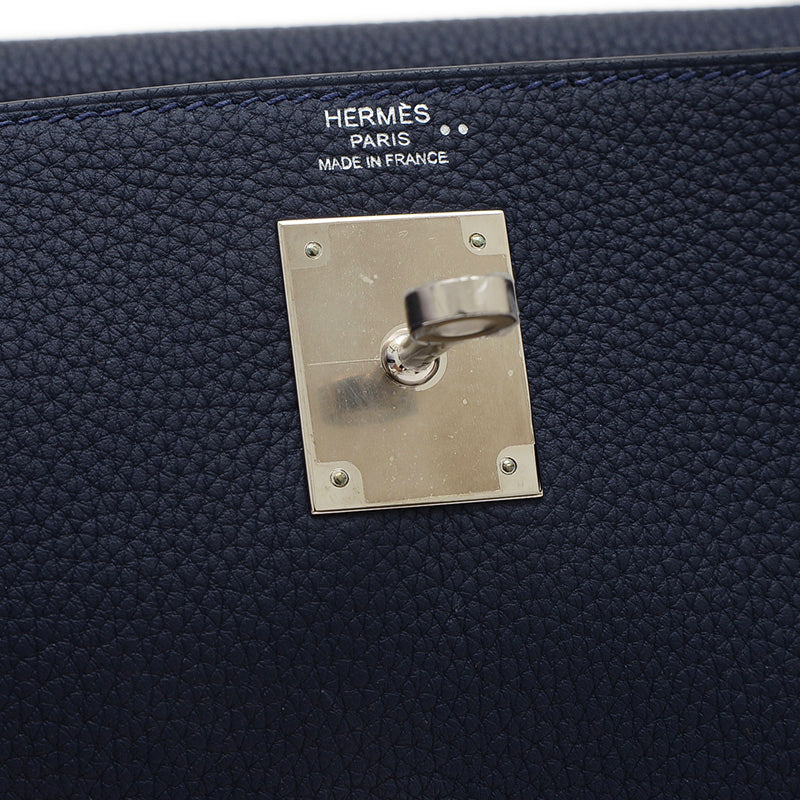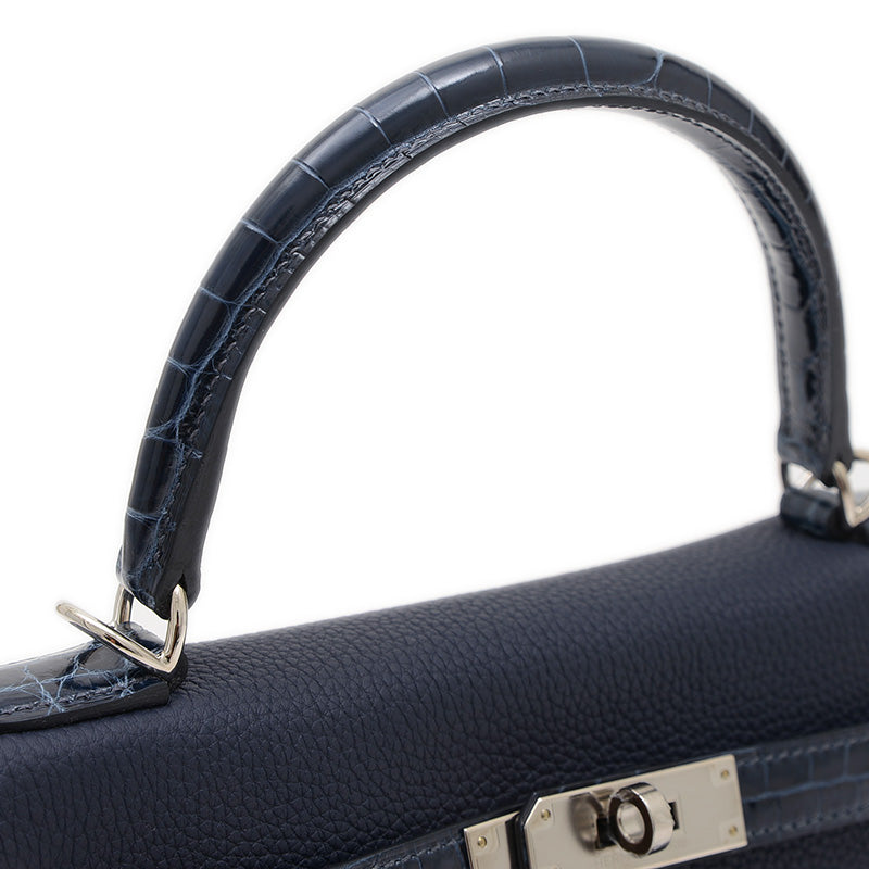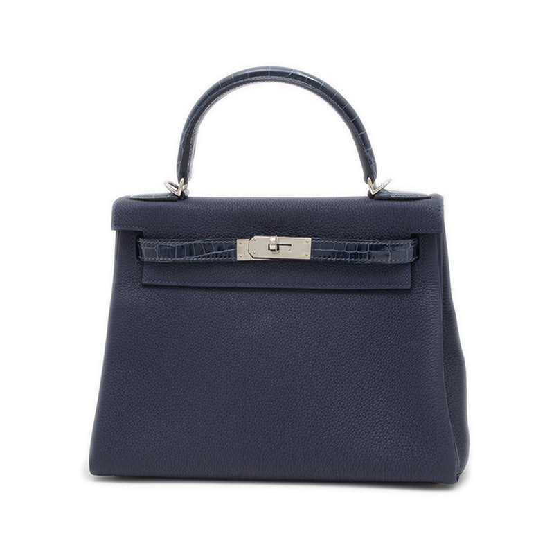 - 縫い目が内側に隠れる仕立てと、しなやかなトゴ素材のブルーニュイ(ミッドナイトブルー)に、ハンドル部分の希少なアリゲーター素材が組み合わされたハンドバッグです。異なる素材のコントラストがシックな配色に洗練された高級感を加え、クールなシルバー金具がエレガントなアクセントになっています。日常使いに最適な28cmサイズながら、ケリーバッグの持つ気品を存分に感じさせる特別な逸品です。