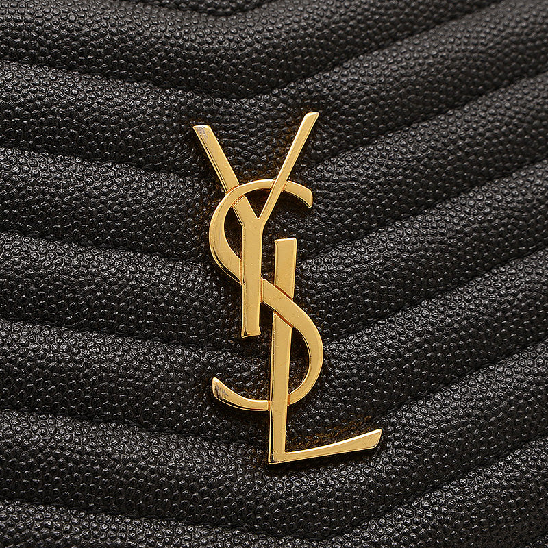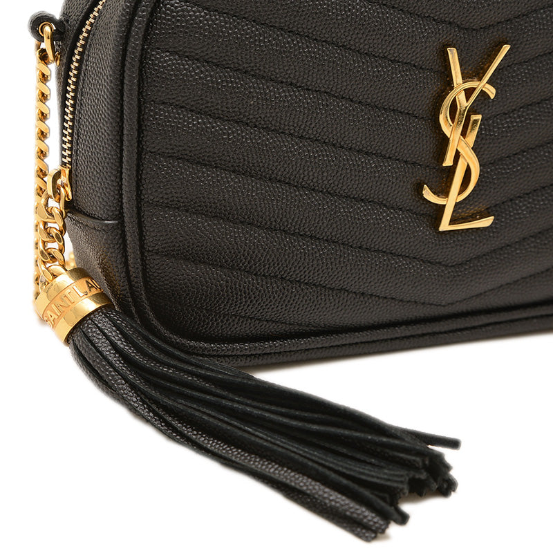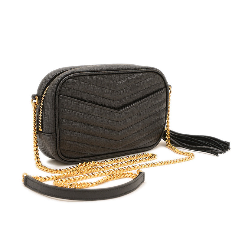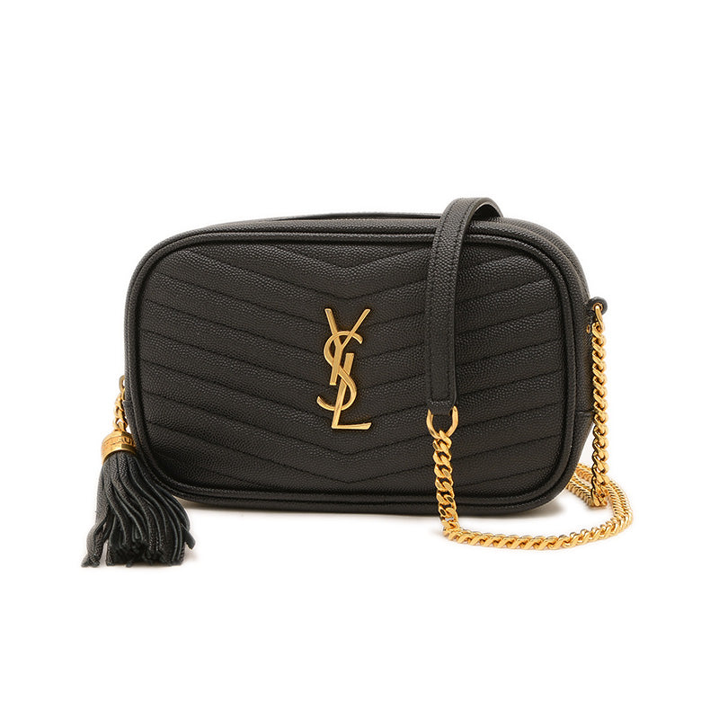 上質なキルティングレザーのブラックに、ブランドを象徴するYSLカサンドラロゴが輝くショルダーバッグです。コンパクトなスクエアフォルムと、取り外し可能なタッセルチャームが特徴。チェーンストラップがエレガントなアクセントとなり、どんな装いも上品に格上げする人気の逸品です。