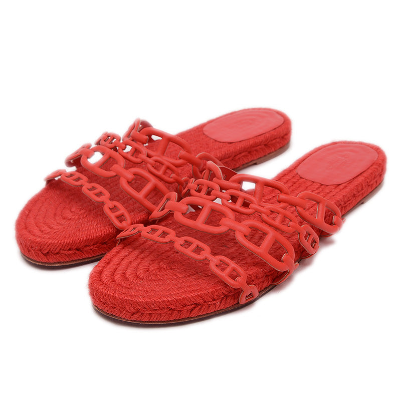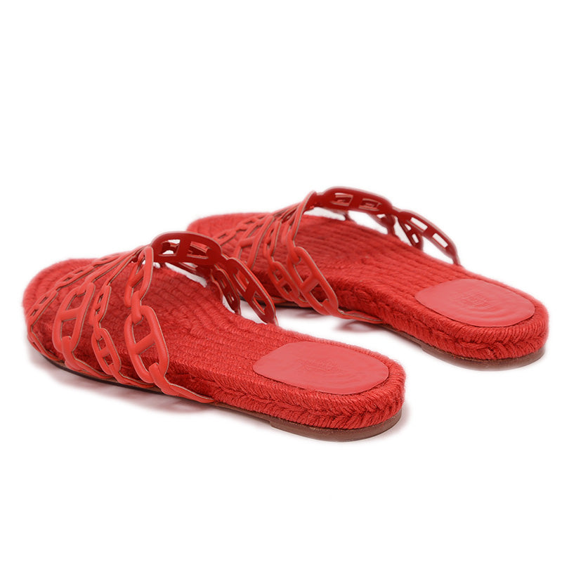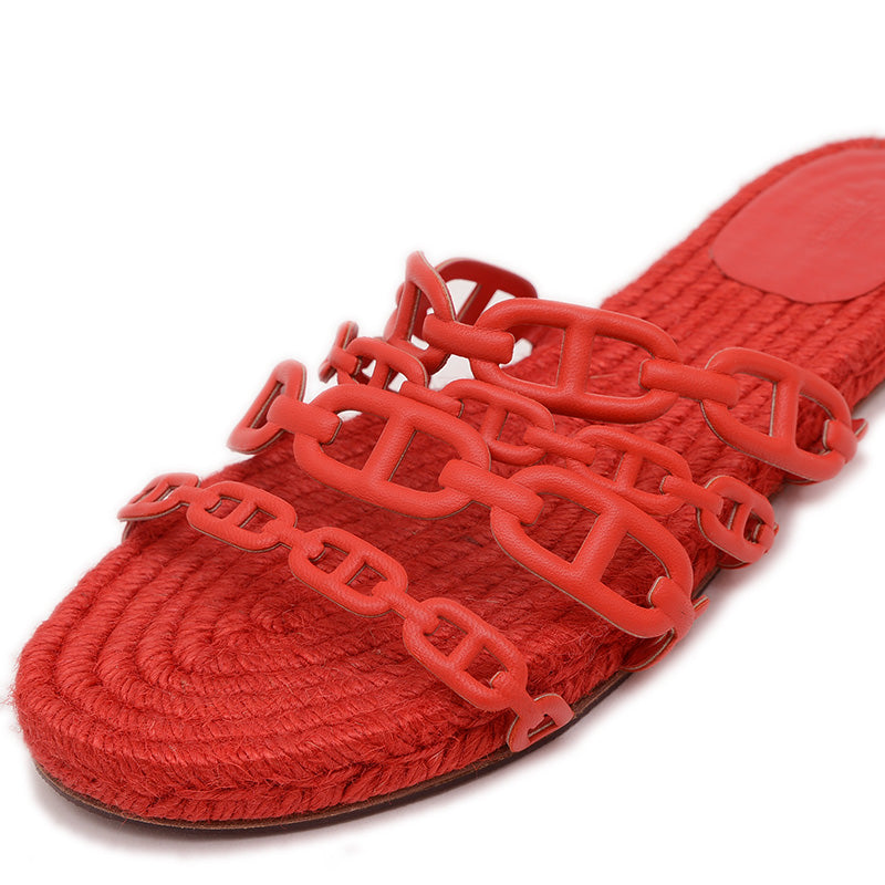 - シェーヌダンクルからインスパイアされたマルチストラップが特徴的なサンダルです。ジュート(麻)とレザーの異素材使いが軽やかさを演出し、情熱的なレッドカラーが足元を華やかに彩ります。カジュアルながらもエルメスらしい洗練されたデザインで、リゾートからタウンユースまで幅広く活躍します。