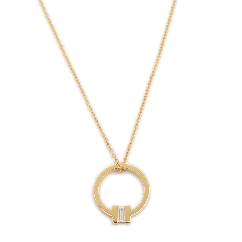 ブランドの頭文字「T」を象った、スクエア型のペンダントが特徴です。温かみのある18Kイエローゴールドにブリリアントカットダイヤモンドがセッティングされており、胸元で上品な輝きを放ちます。ミニマルでモダンなデザインは、どんなスタイルにも洗練されたアクセントを添える、人気の高いジュエリーです。