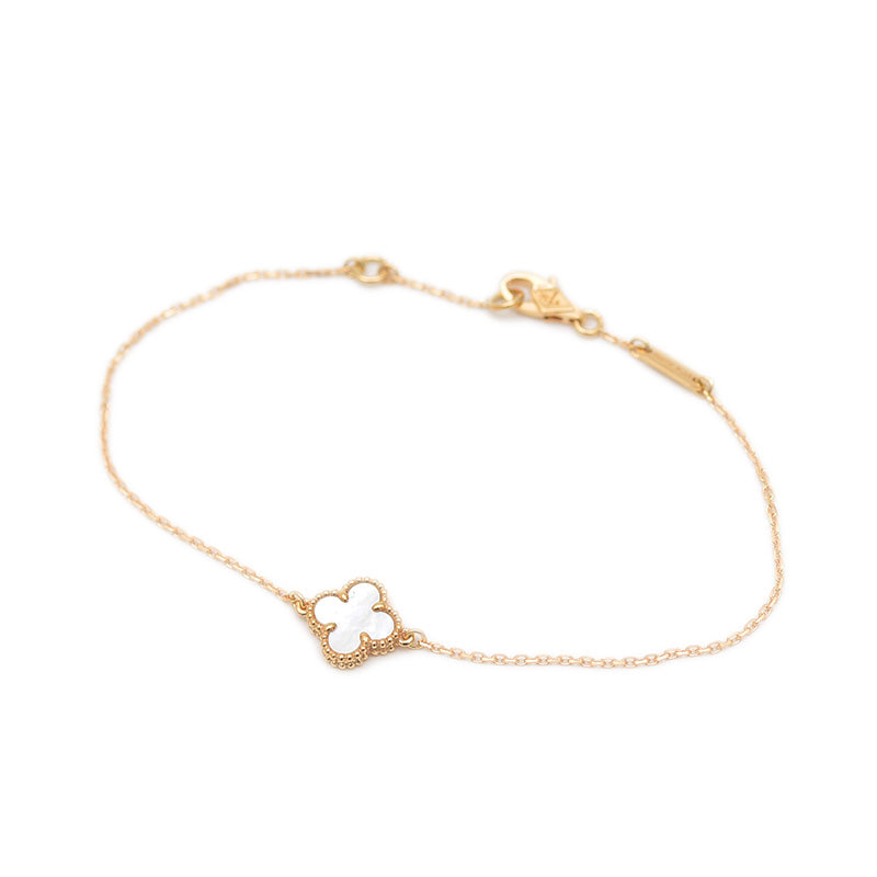 - ブランドを象徴するクローバーモチーフが、愛らしいミニチュアサイズでデザインされたブレスレットです。温かみのある18Kイエローゴールドと、神秘的な輝きを放つマザーオブパールの組み合わせが、手首に上品で可憐な華やかさを添えます。日常の装いにさりげないエレガンスをプラスする、タイムレスな魅力を持つ人気の逸品です。
