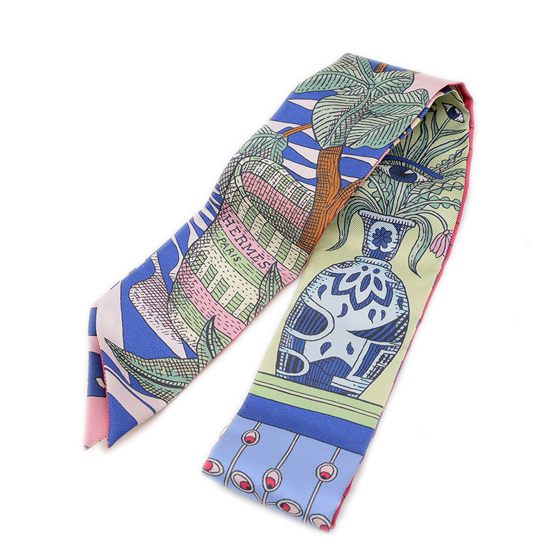 - スリムなシルクツイル製のスカーフです。馬に乗った女性のモチーフやダンスの躍動感が描かれた、華やかでエキゾチックなデザインが特徴。ブルーロワイヤル、ジョーヌ(イエロー)、マルチカラーという鮮やかな配色が、バッグのハンドルに巻いたり、首元や手首に巻いたりと、多様なアレンジで装いに上品な彩りと遊び心を添えます。