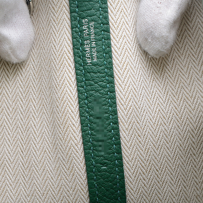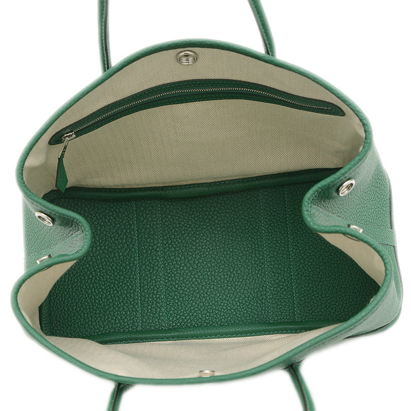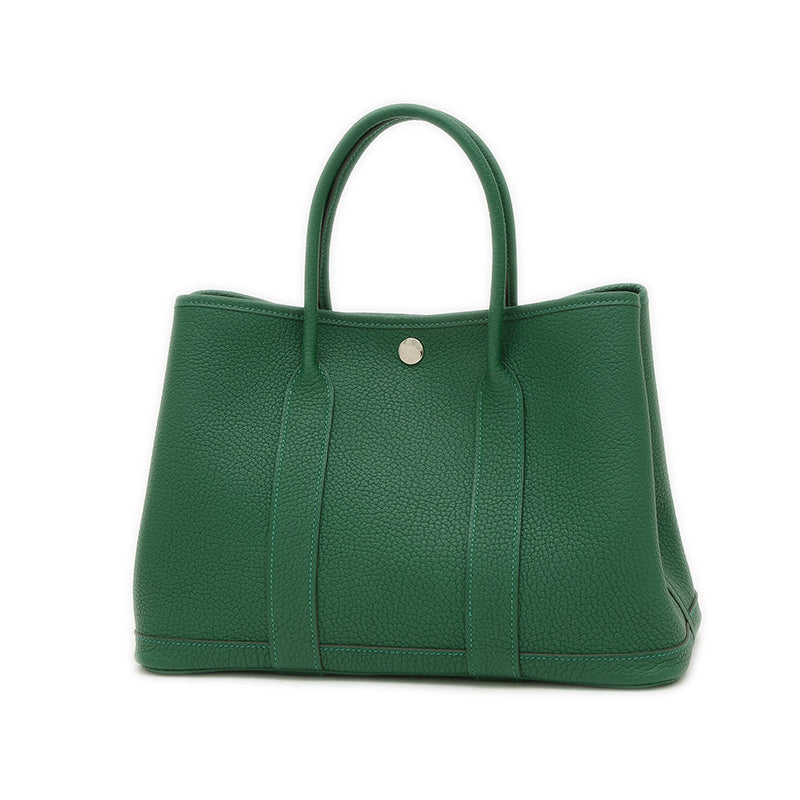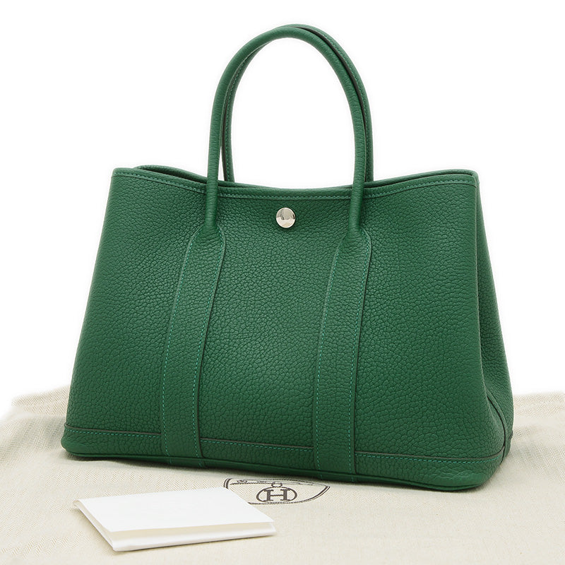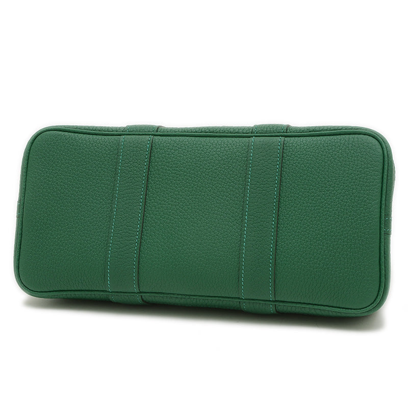 エルメスの人気トートバッグ「ガーデンパーティ」のTPMサイズ(30cm)で、柔らかく傷がつきにくいネゴンダ素材の落ち着いたグリーンが特徴です。カジュアルながら上品で、日常使いしやすいデザインです。