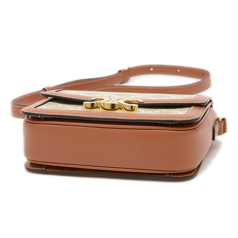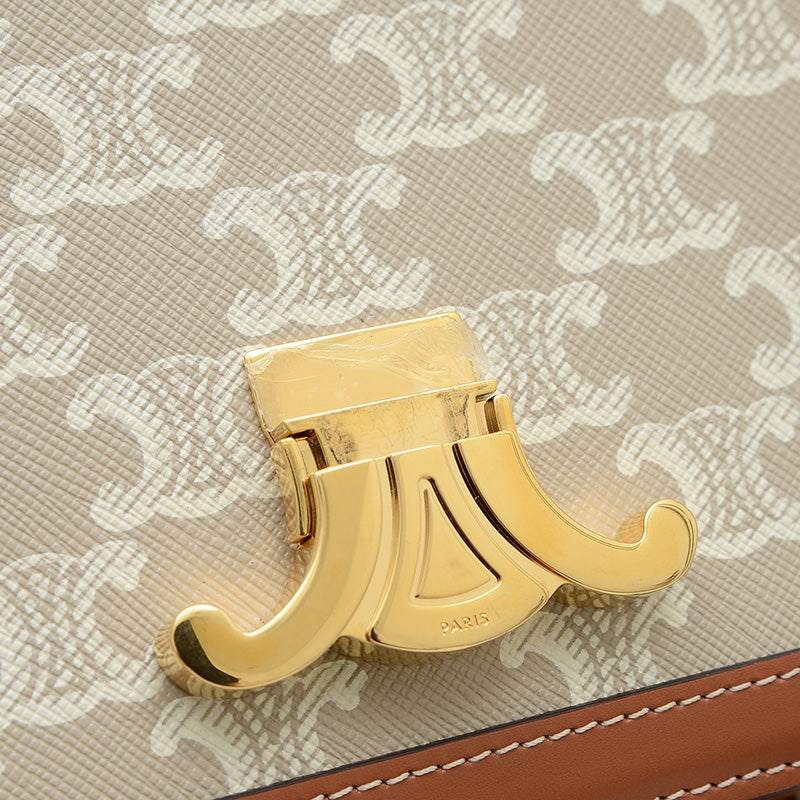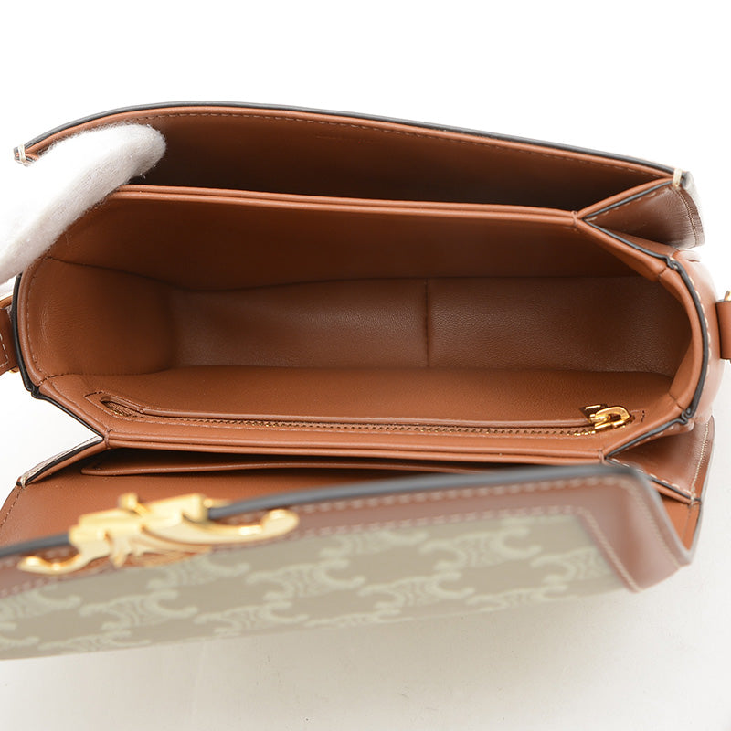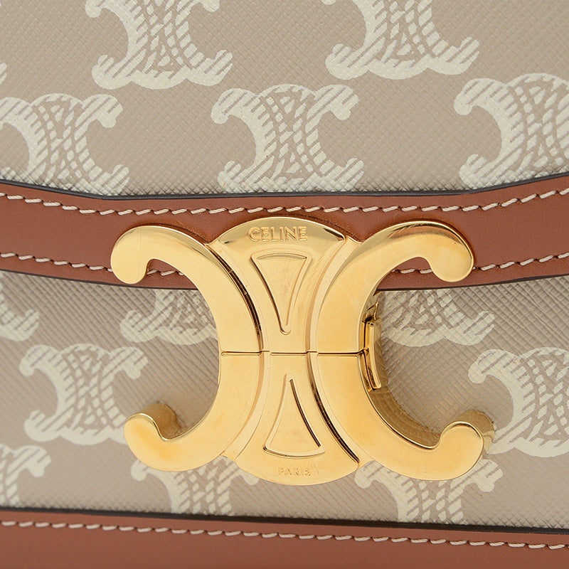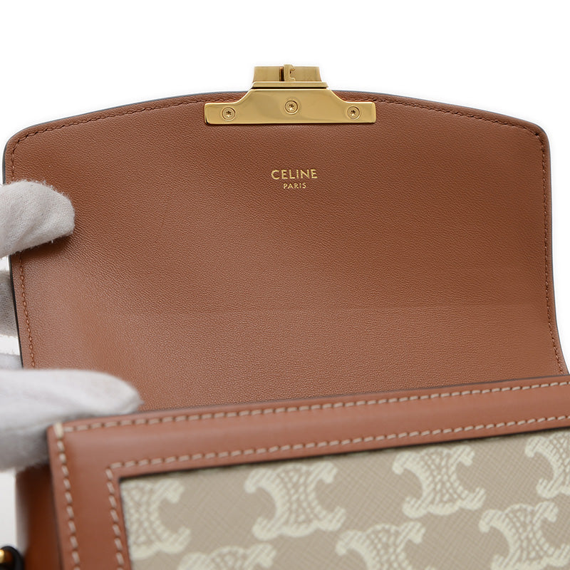 セリーヌを象徴するトリオンフキャンバスとカーフスキンを組み合わせた素材に、トリオンフのメタリッククロージャーが特徴。コンパクトながらも内側に複数のコンパートメントがあり、クロスボディとしてもショルダーとしても使える調節可能なストラップで、幅広いスタイルに合わせやすい人気のモデルです。