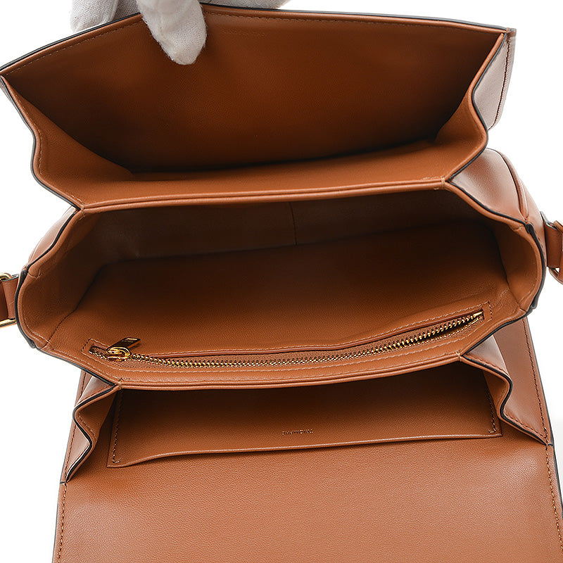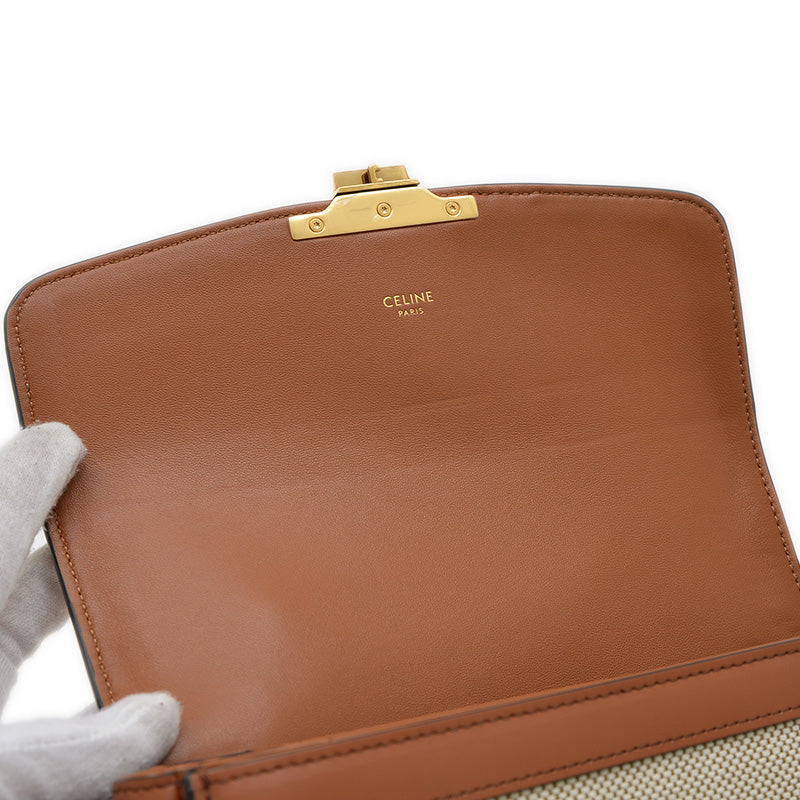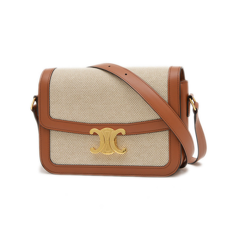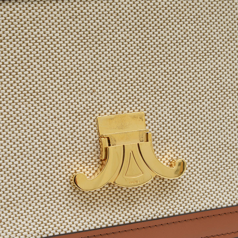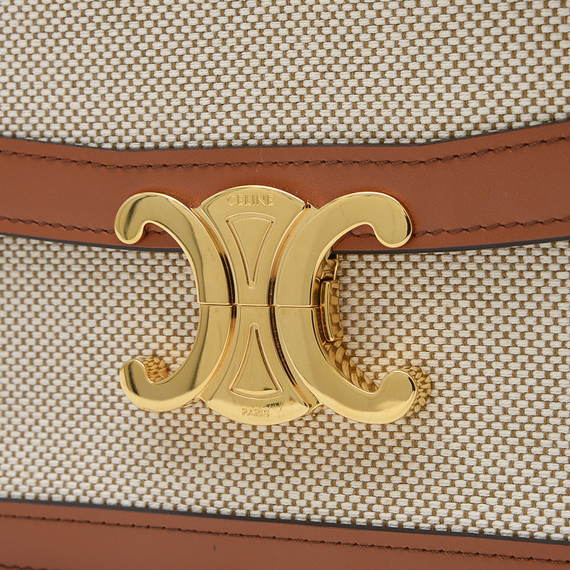 - テキスタイル(キャンバス)素材とカーフスキンの組み合わせに、セリーヌのアイコンであるトリオンフのメタリッククロージャーが特徴で、上品かつクラシカルなデザインが魅力です。