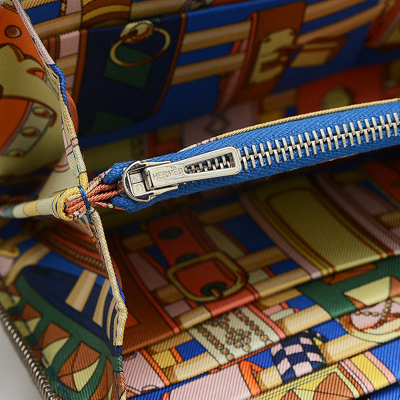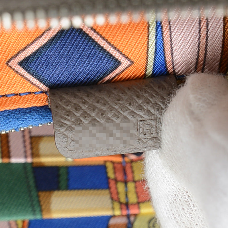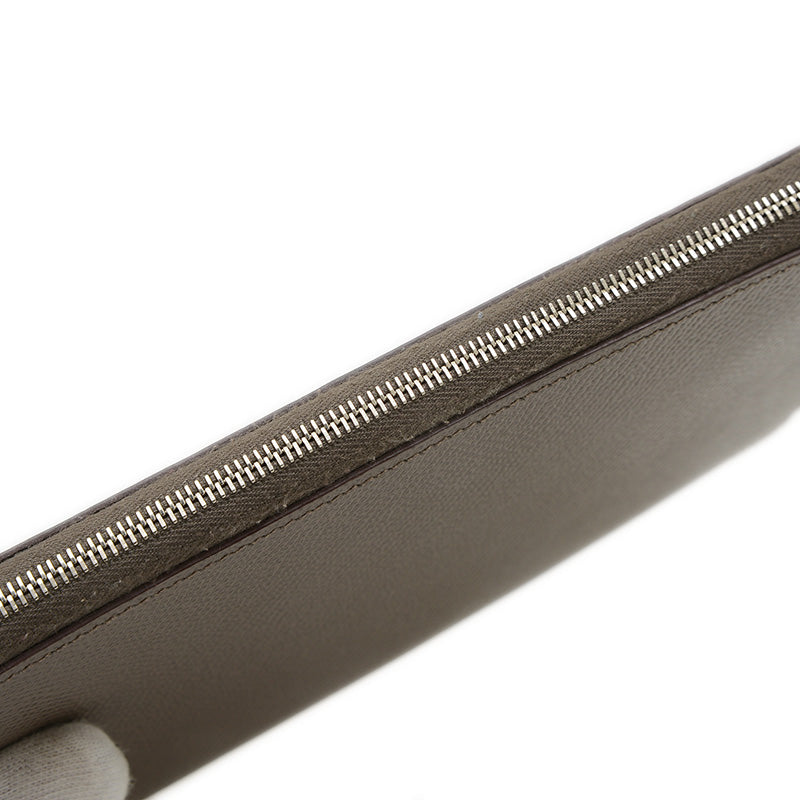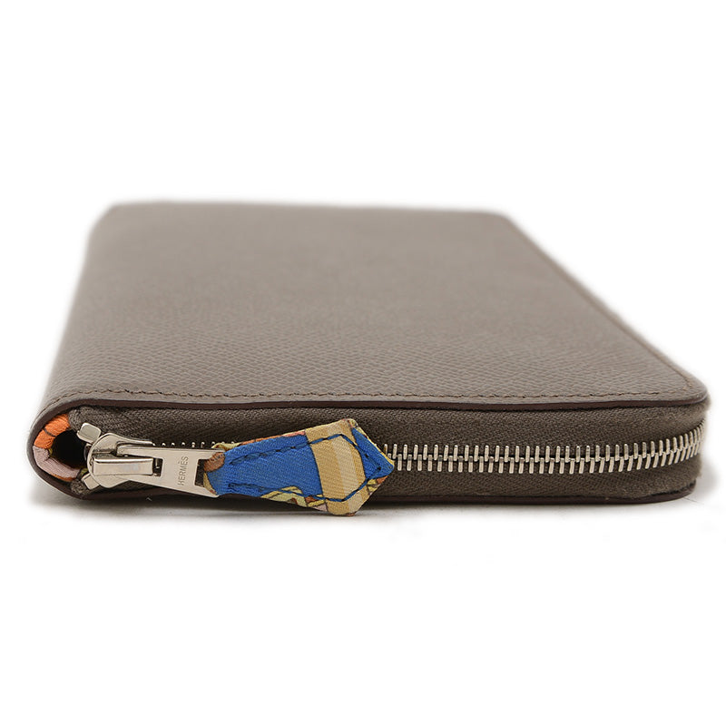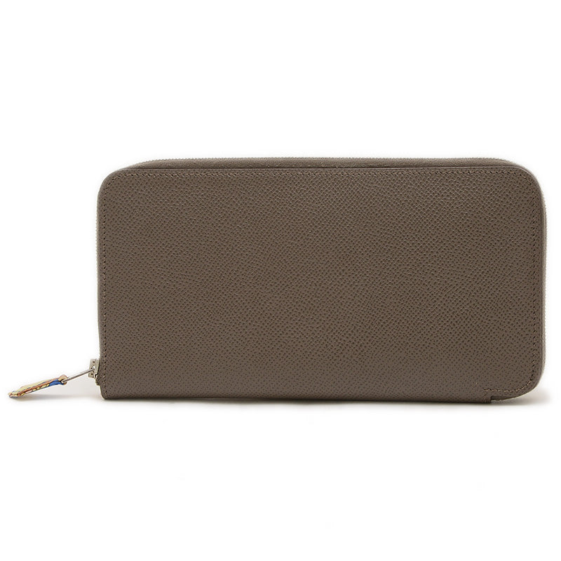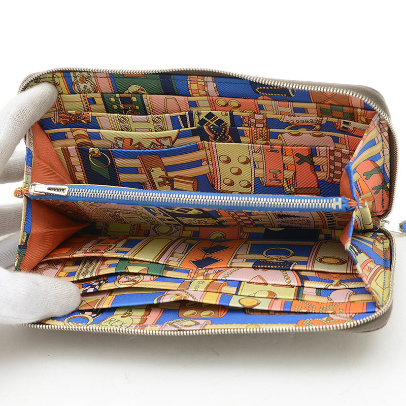 - 外側は傷がつきにくいエプソン素材のシックなエトゥープカラー、内側には美しいエルメスのシルクスカーフ柄が広がる、上品さと遊び心を兼ね備えた長財布です。ラウンドファスナーで収納力も高く、日常使いに最適です。