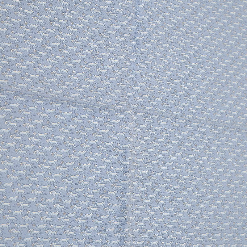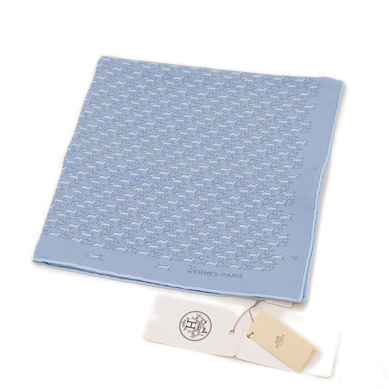 - 上質なヴィンテージシルクを使用した、45cm角の小ぶりなポケットチーフです。アズール(青)、グリ(グレー)、シエル(水色)、ブラン(白)の鮮やかな色彩で、ボール遊びをする犬が描かれた「LA BABALLE」柄が、遊び心とユーモアを添えます。ジャケットの胸元に挿すだけで、装いに上品な彩りと個性的なアクセントをプラスする逸品です。