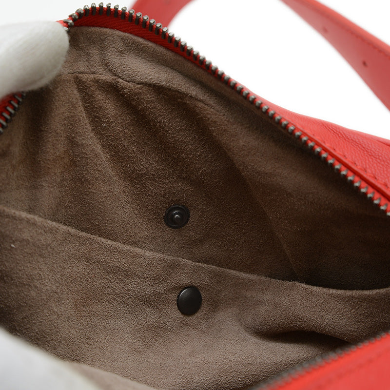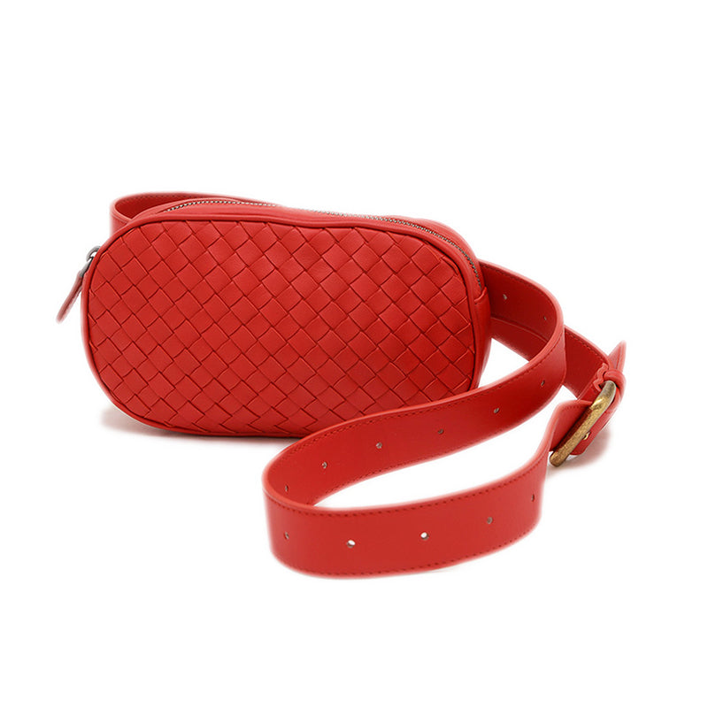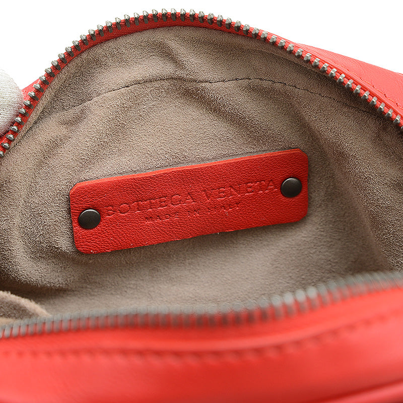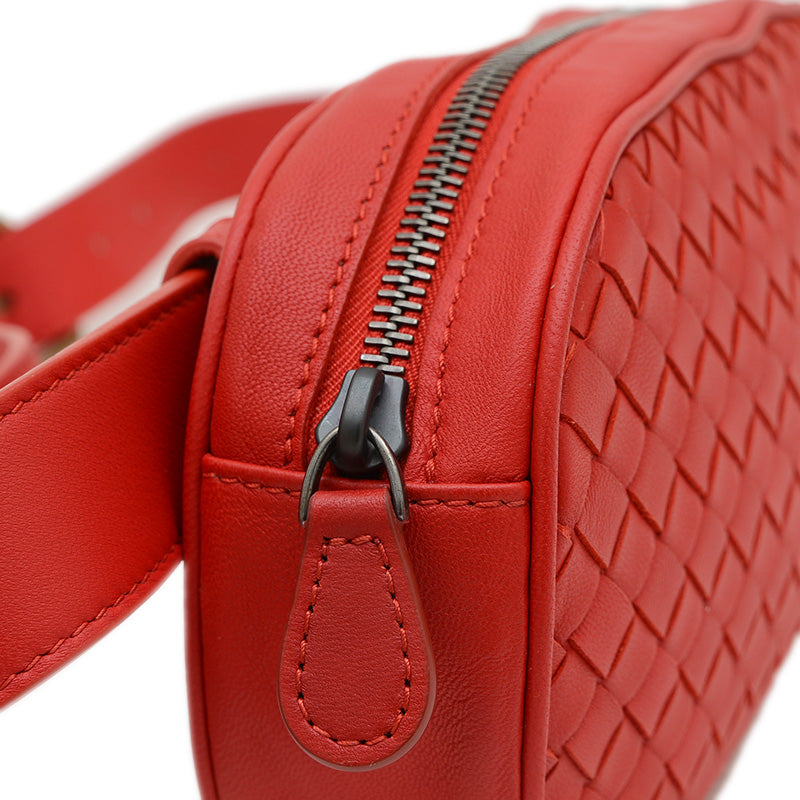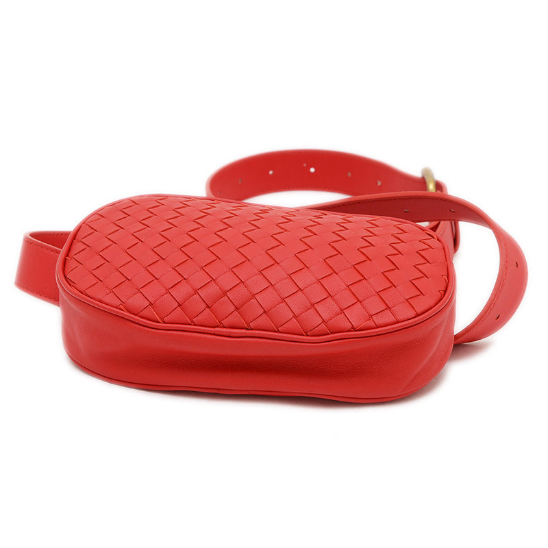 ブランドの象徴である手作業で編み込まれたイントレチャートレザーが特徴的なボディバッグです。鮮やかなレッドカラーが目を引くデザインで、コンパクトながらも必需品をスマートに収納できます。斜め掛けでカジュアルにも、ウエストバッグとしても使えるため、日常のコーディネートに個性と洗練された印象を添える逸品です。