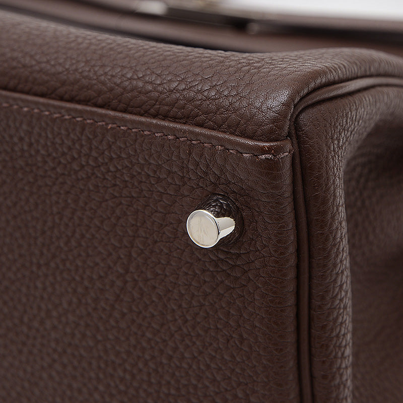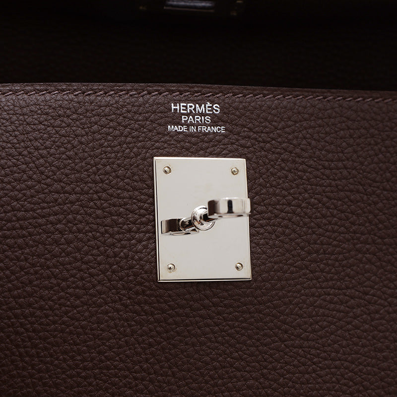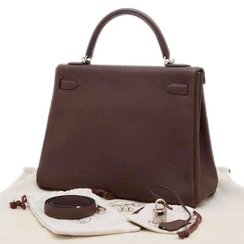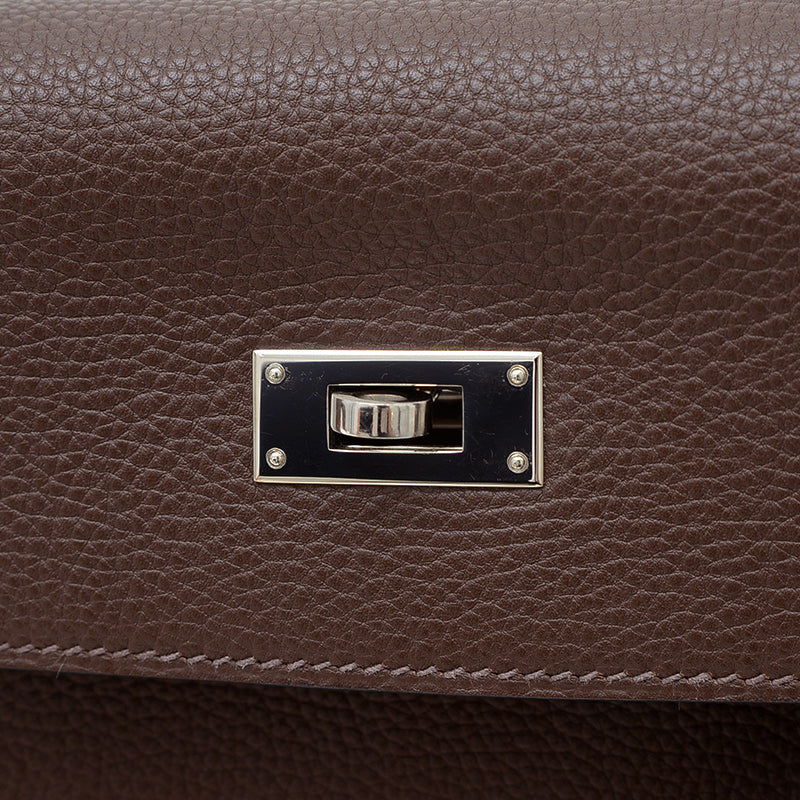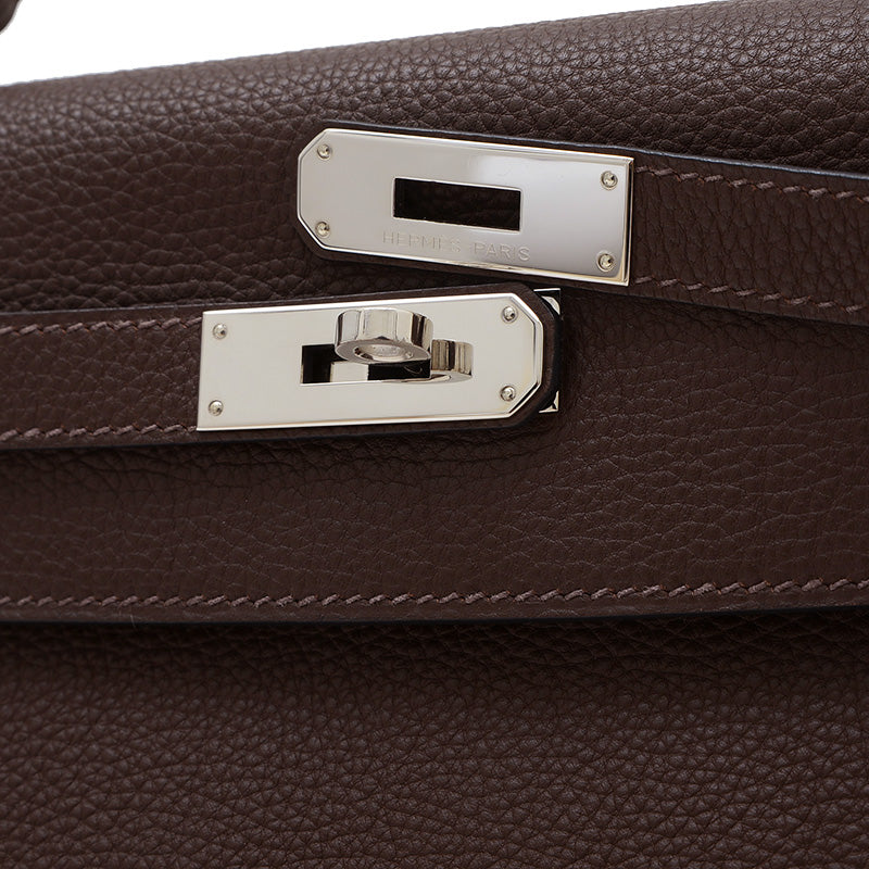 - 縫い目が内側に隠れる「内縫い」仕立てと、しなやかで人気の高いトゴ素材が特徴のハンドバッグです。深みのあるショコラ(ダークブラウン)カラーに、クールなシルバー金具が洗練された印象を与えます。日常使いに最適な32cmサイズながら、ケリーバッグの持つ気品を存分に感じさせ、様々なシーンで活躍する逸品です。