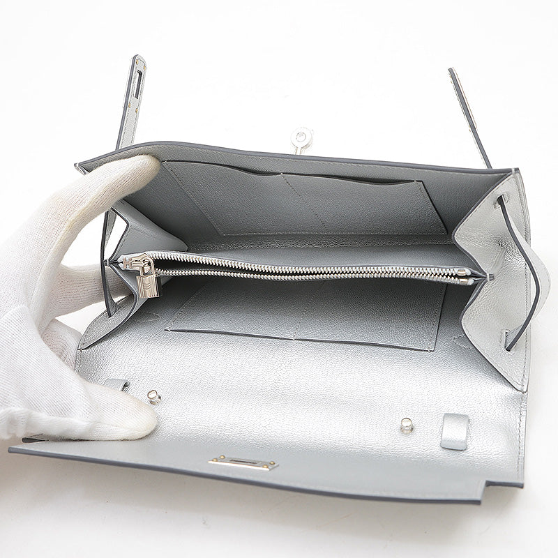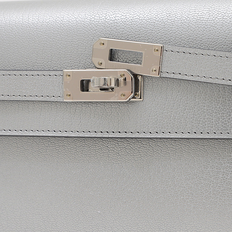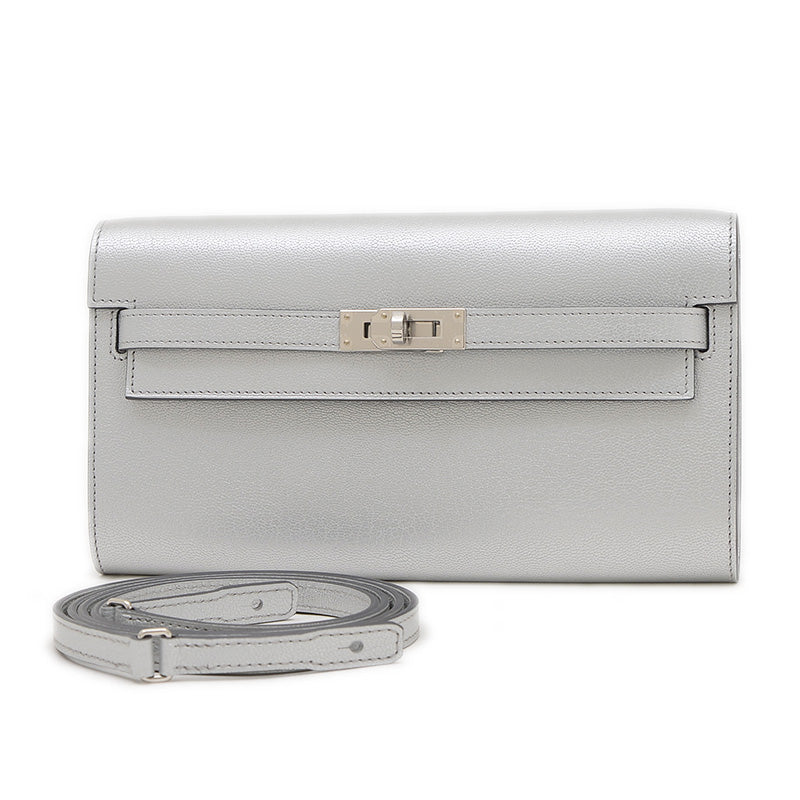 ケリーバッグのアイコニックなクラスプを配した、エレガントなチェーンウォレットです。希少なシェブルシャムキラ素材のシルバーカラー「アルジャン」が、メタリックな輝きを放ち、クールなシルバー金具が洗練された印象を与えます。スマートフォンやカード類を収納でき、日常使いからパーティーシーンまで幅広く活躍する、機能的かつ華やかな逸品です。