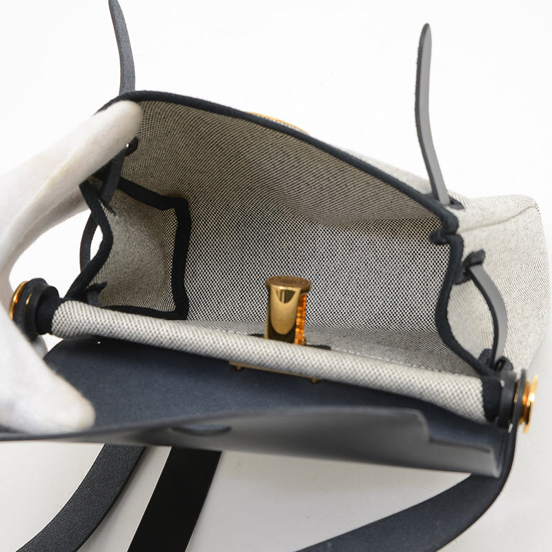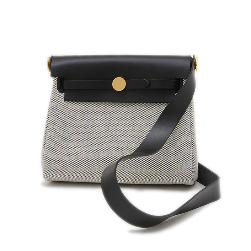 - ケリーバッグから着想を得た上品なフォルムと、丈夫なトワル素材のブラックとグレーのバイカラーデザインが特徴のミニハンドバッグです。ゴールド金具がクラシカルなアクセントとなり、コンパクトながらも日常の必需品をスマートに収納できます。取り外し可能なショルダーストラップ付きで、ハンドバッグとしてもクロスボディとしても楽しめる、機能性とエレガンスを兼ね備えた人気のアイテムで