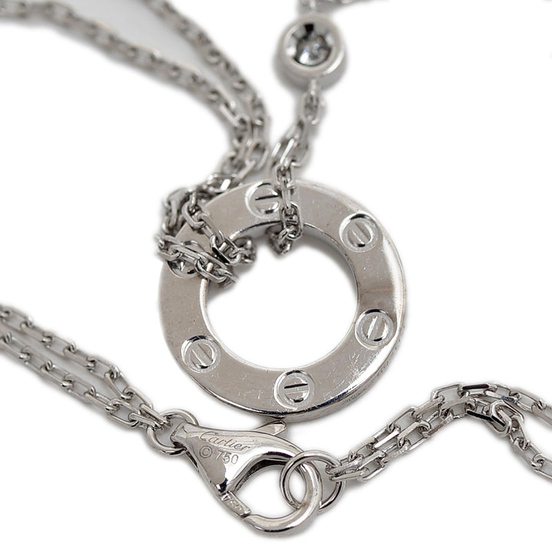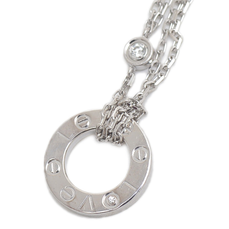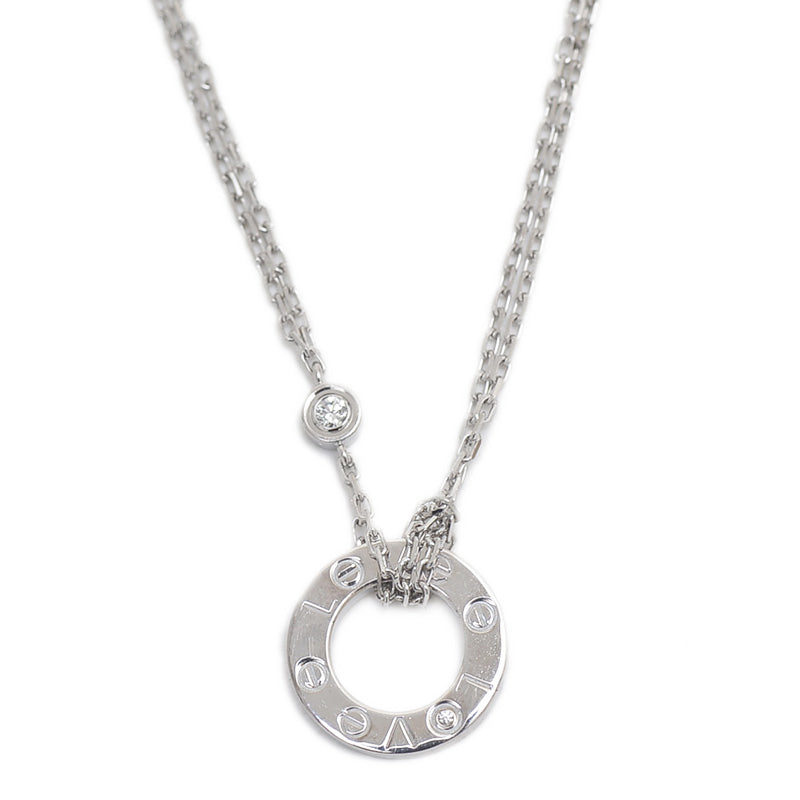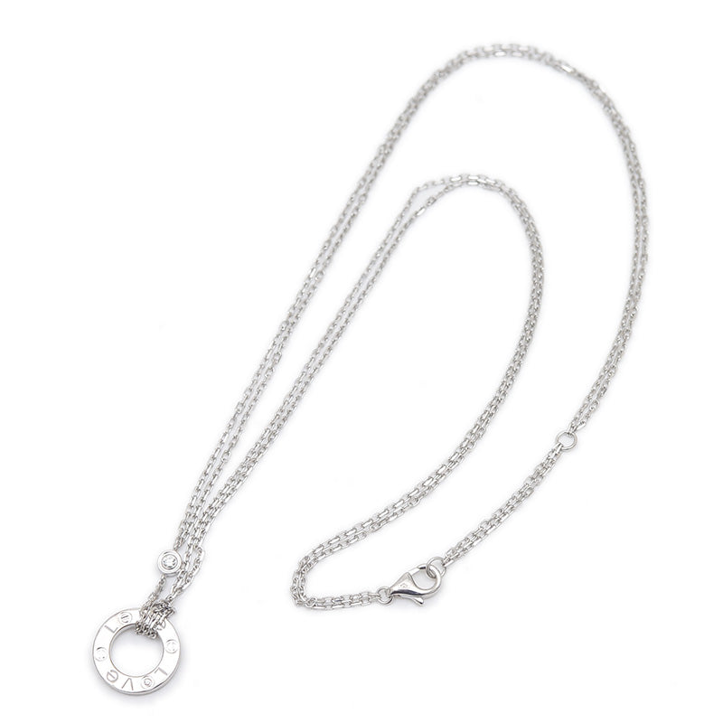- 愛の絆を象徴するラブコレクションのネックレスです。純粋な輝きを放つ18Kホワイトゴールドのリングに、2石のブリリアントカットダイヤモンドがセッティングされており、控えめながらも上品な輝きが胸元を彩ります。シンプルでタイムレスなデザインは、日常使いから特別な日まで、あらゆるシーンで愛とエレガンスを表現する逸品です。