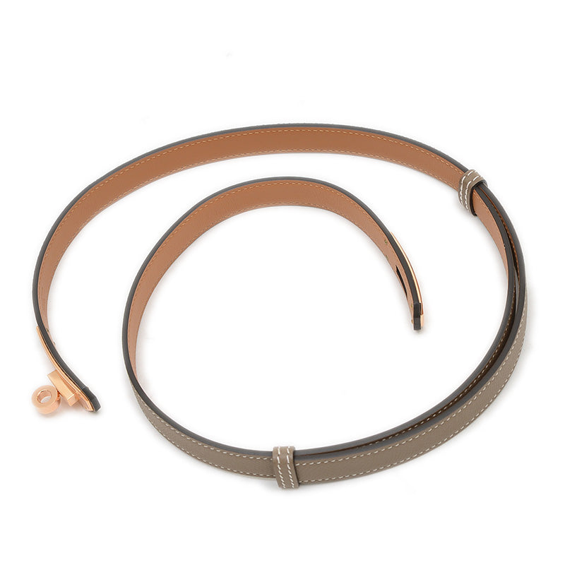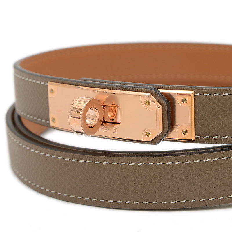 エトゥープのグレージュにローズゴールドがよく映え、硬く型崩れしにくいエプソンレザーが長く美しさを保つ、毎日の装いに洗練のアクセントを添えるケリーベルトです。