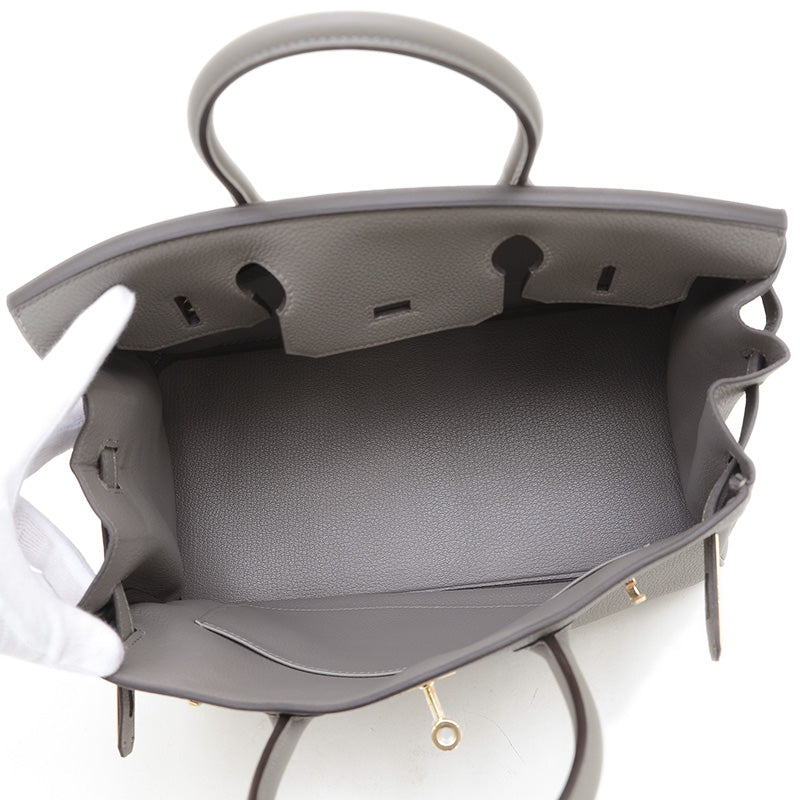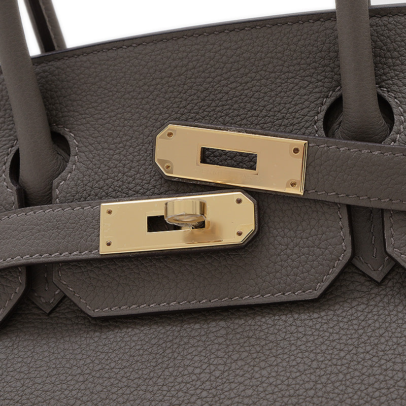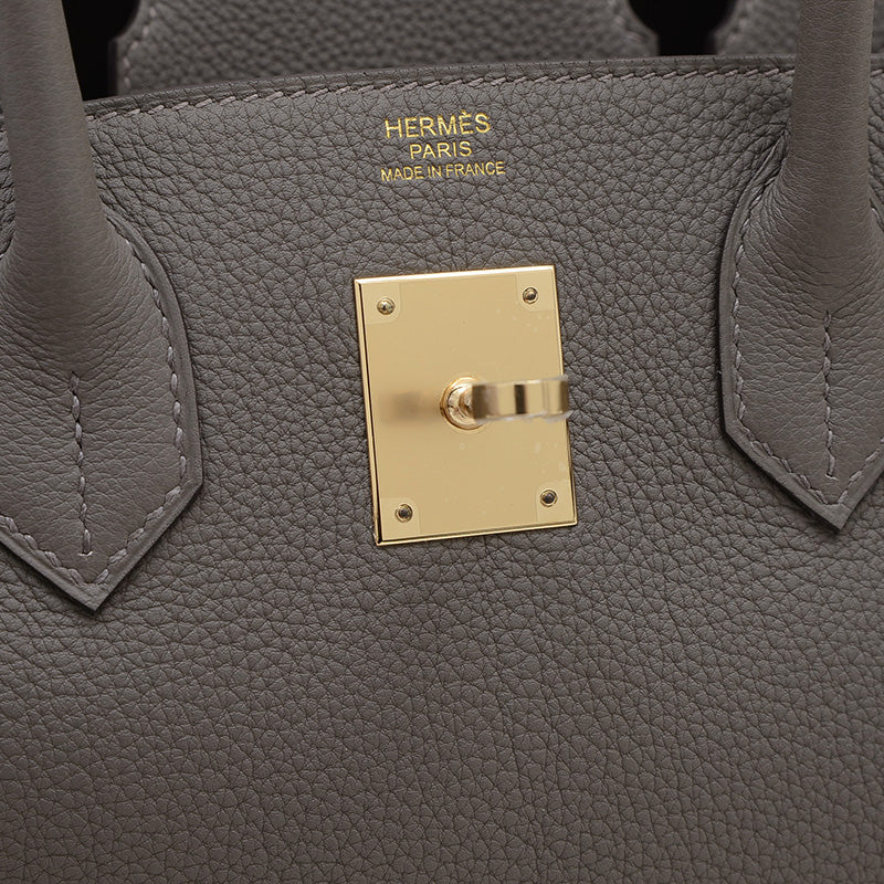 - 洗練のグレーと艶やかなゴールドの金具が織りなす上品な色彩バランスが魅力。耐久性高いトゴレザーで日常使いに優れつつ、バーキンの象徴的フォルムが気品を放ちます。
