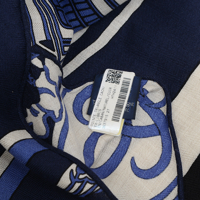 カシミヤとシルクを混合した大判の三角形ショールです。ブランドの象徴であるエクスリブリス(蔵書票)のモチーフが、カバン(ダークブラウン)、ナチュラル、キュイール(レザー色)という落ち着いた色合いで繊細に描かれています。独特のフォルムと上質な素材が、首元や肩に巻くだけで上品な華やかさを演出し、多様なアレンジを楽しめる逸品です。