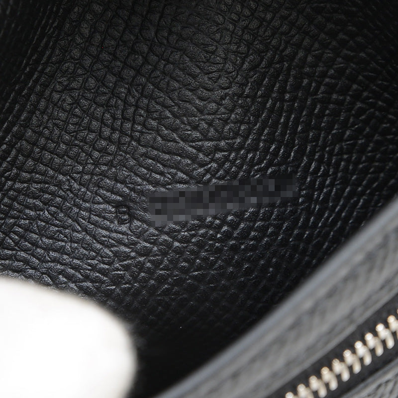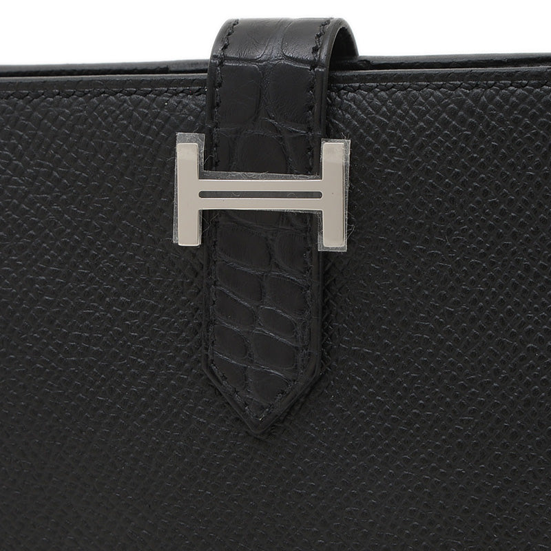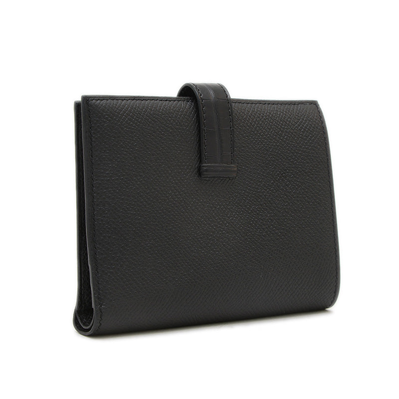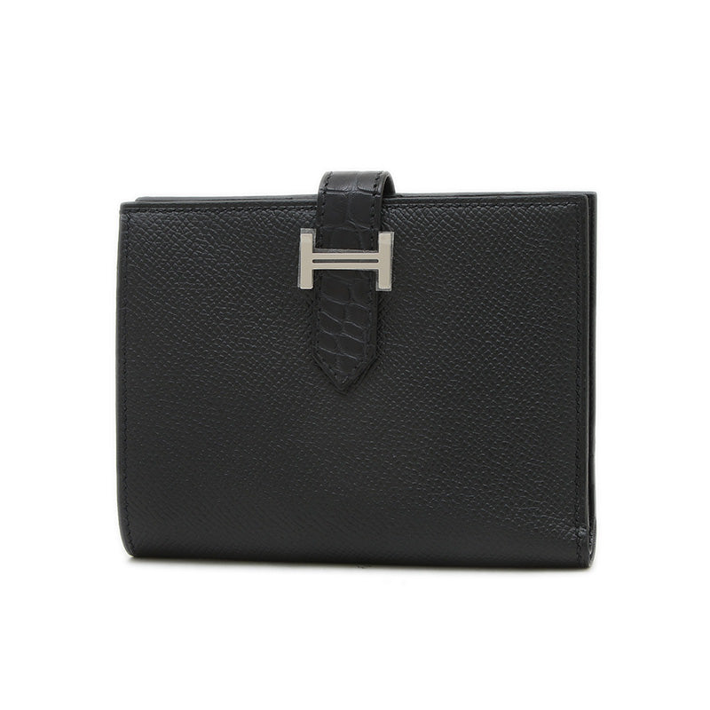 - H型のクラスプが特徴的な二つ折り財布です。傷に強いエプソン素材のブラックに、留め具のベルト部分には希少なアリゲーター素材が使用されており、異なる素材の組み合わせが洗練された高級感を演出します。コンパクトながらも収納力と機能性を兼ね備え、日常に特別な彩りを添える逸品です。