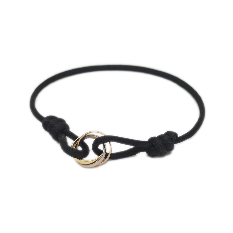 18金のイエロー・ホワイト・ピンクゴールドが織りなすスリーカラーが上品に輝く、トリニティブレスレット。コットンコードでカジュアルさも兼ね備え、日常使いにも最適な一本です。