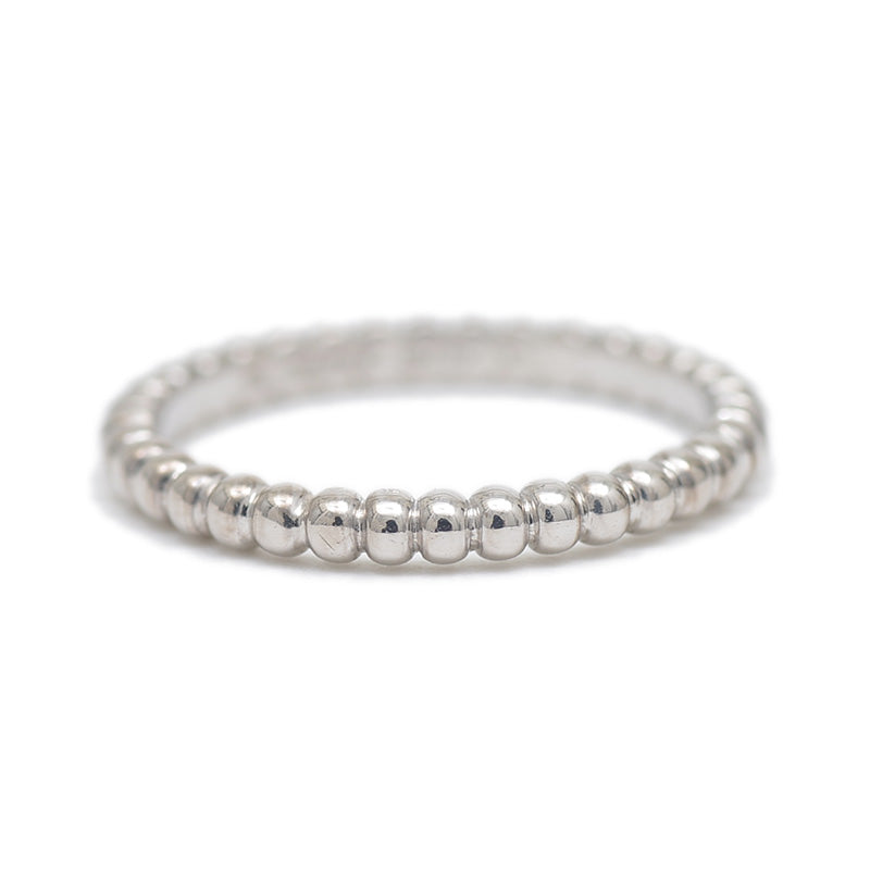 まるで金の粒が連なったかのような繊細なデザインが特徴のリングです。純粋な輝きを放つ18Kホワイトゴールドが、手元に上品で洗練された印象を与えます。単独で着けても、他のリングと重ね付けしても美しく、タイムレスな魅力を持つヴァンクリーフ&アーペルらしいエレガントなジュエリーです。