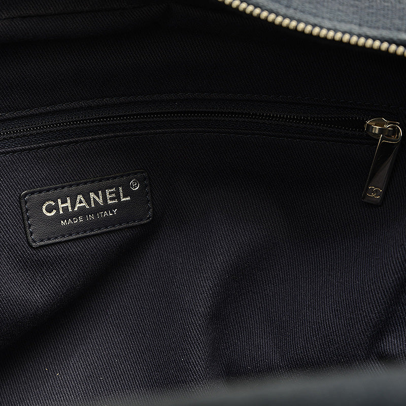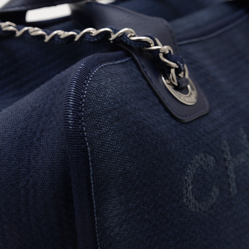 - 軽やかなキャンバス素材のネイビーカラーに、フロントの「CHANEL」ロゴが大胆にあしらわれた2WAYバッグです。コロンとしたボーリングバッグのフォルムと、レザーとチェーンが組み合わされたハンドルが特徴。日常使いに最適なサイズ感で、カジュアルながらも洗練されたスタイルを演出する人気のアイテムです。