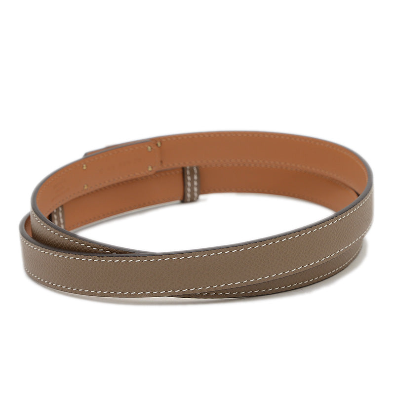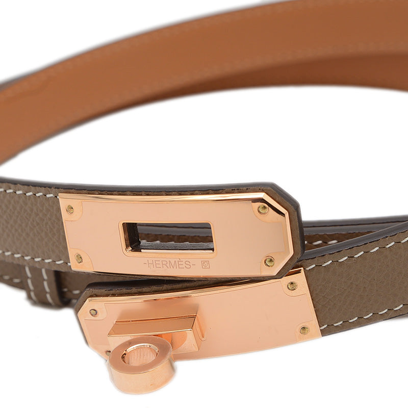ケリーバッグのアイコニックな金具をバックルにあしらったエレガントなベルトです。傷に強く型崩れしにくいヴォー・エプソン素材の落ち着いたエトゥープカラーに、温かみのあるローズゴールド金具が組み合わされています。細身の18mm幅は、ウエストマークやパンツスタイルにさりげなくエルメスらしさを添え、装いを上品に引き締めます。