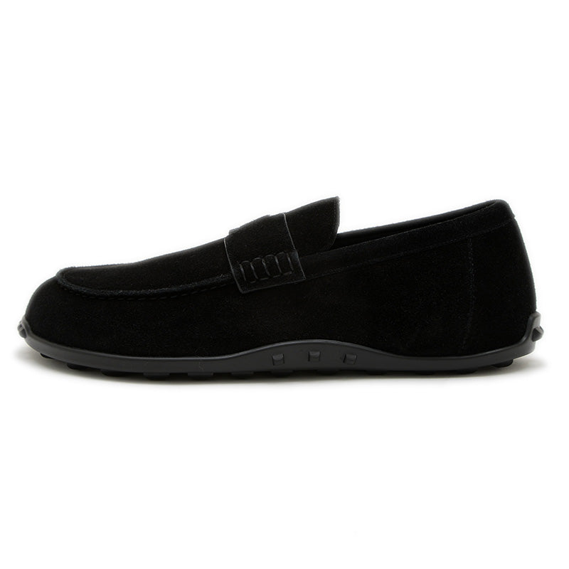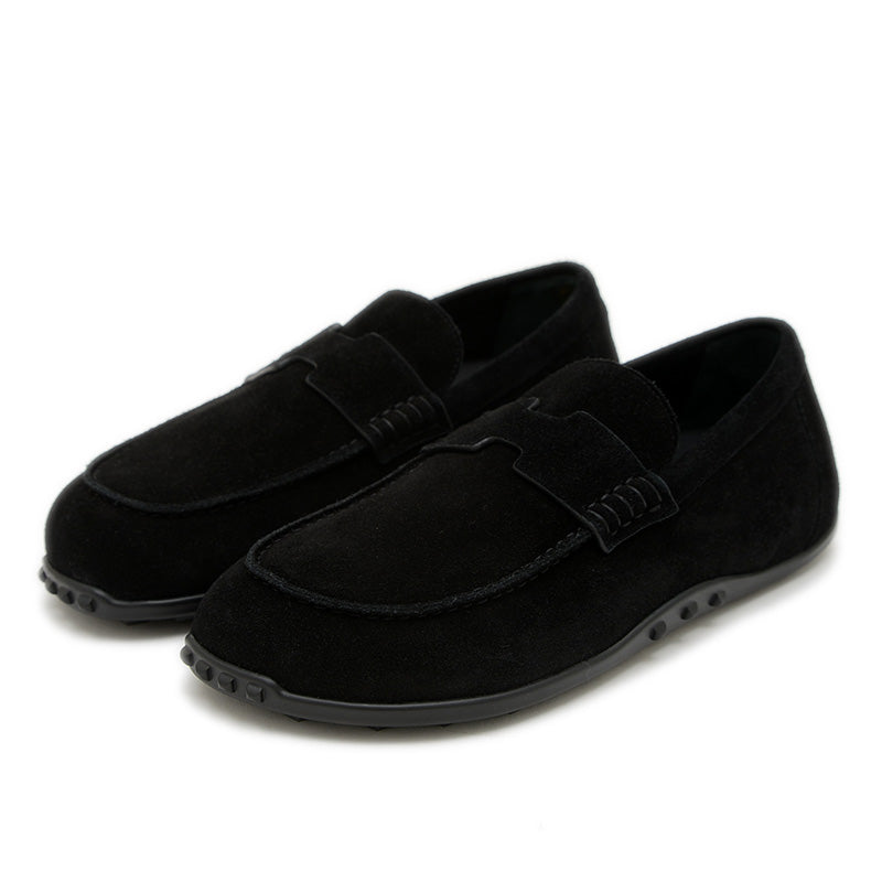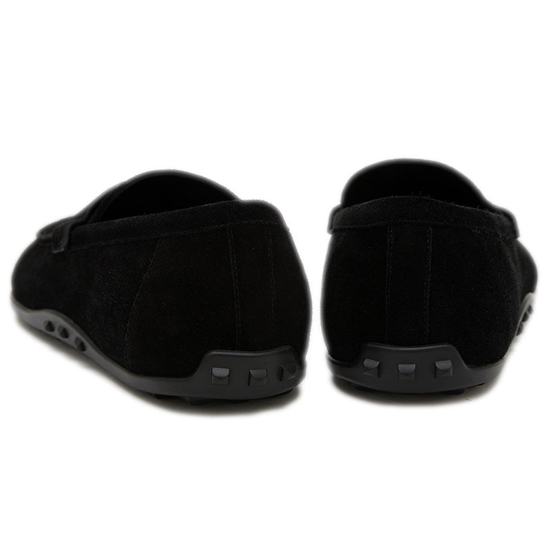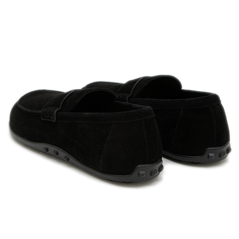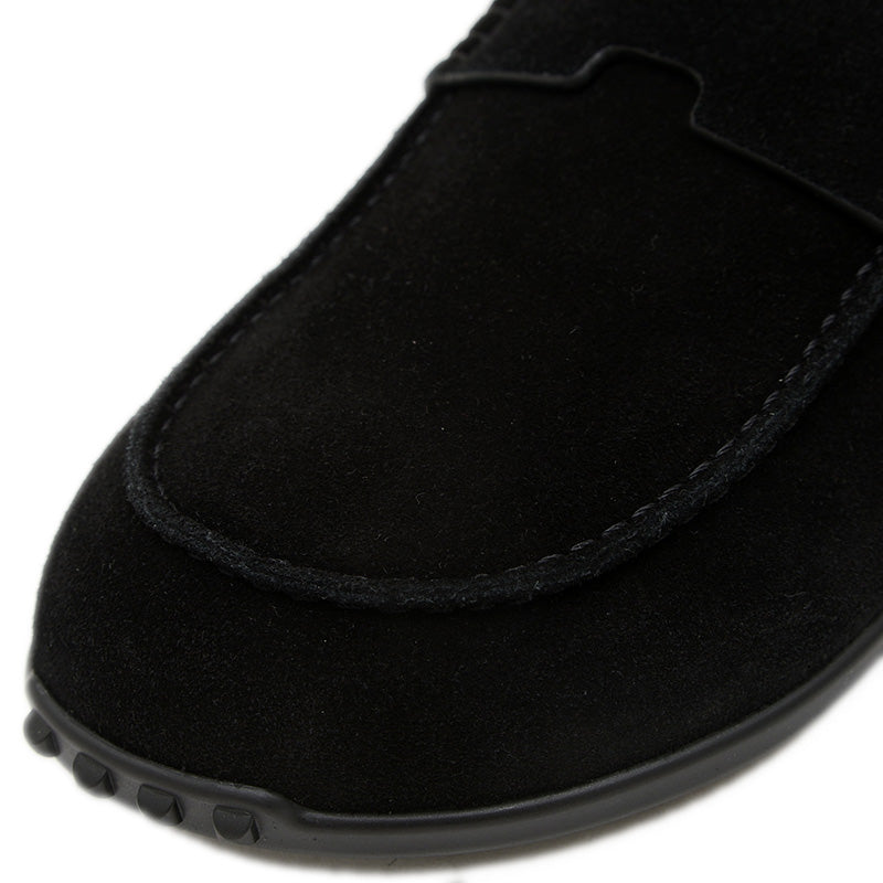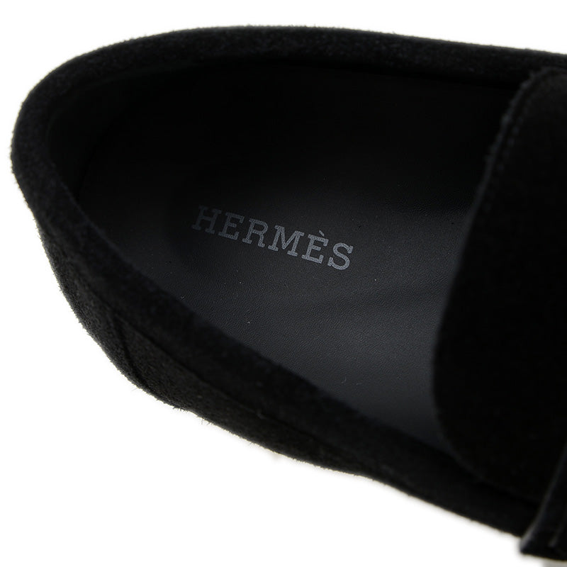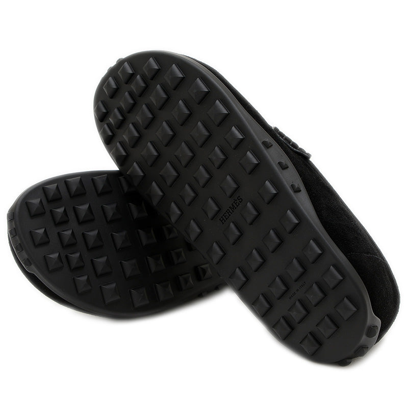 - 柔らかなヴォーヴェロア(スエード)素材のシックなブラックカラーが特徴のモカシンです。甲部分にあしらわれた「H」のカットディテールが、さりげなくブランドのエレガンスを表現しています。非常に軽量で、素足でも快適な履き心地を提供し、リラックスしたスタイルに上品さをプラスする一足です。