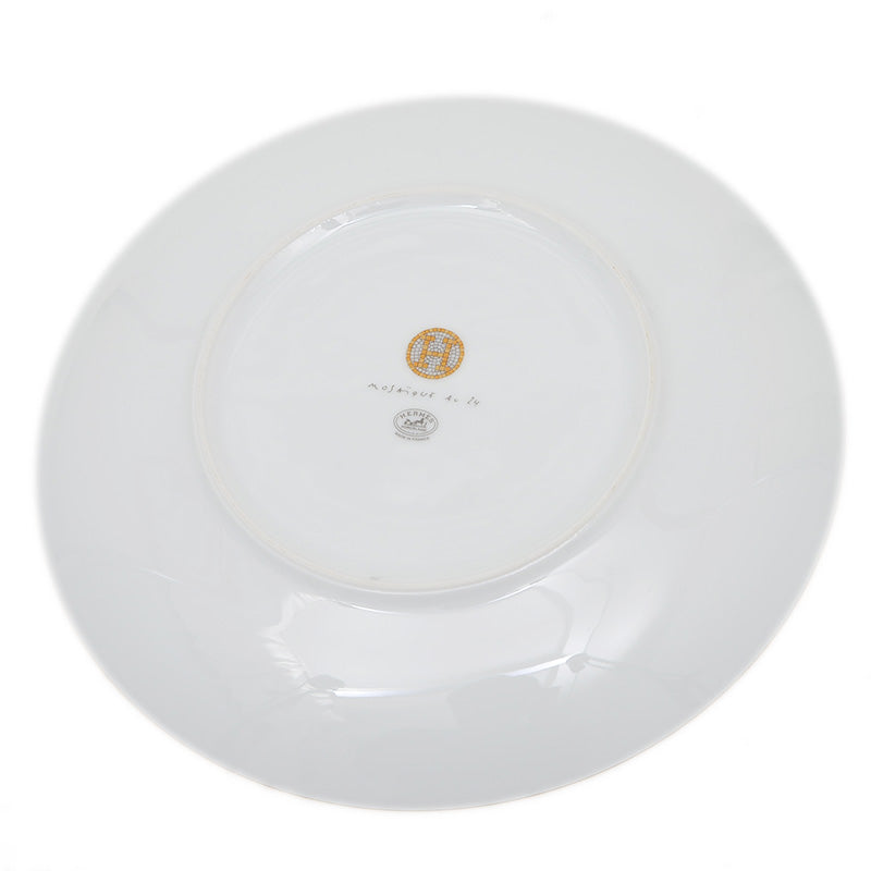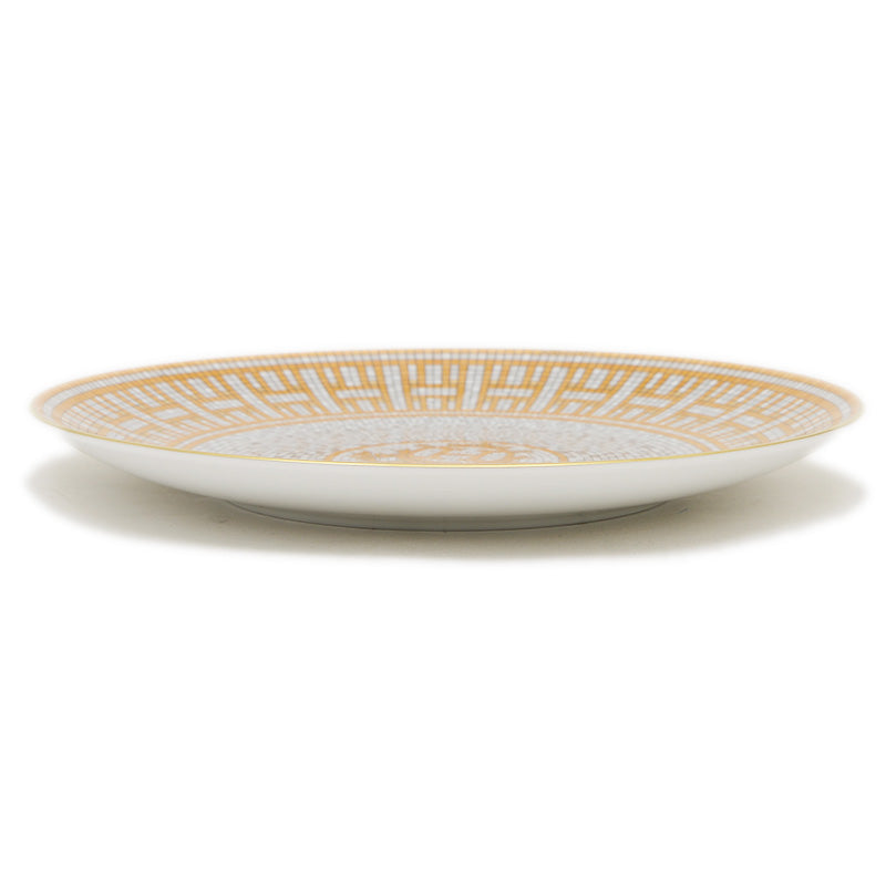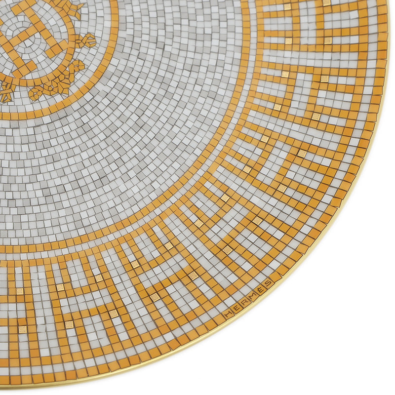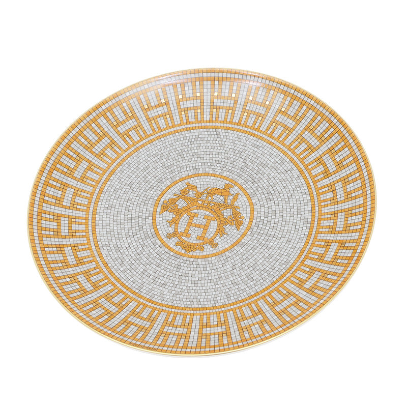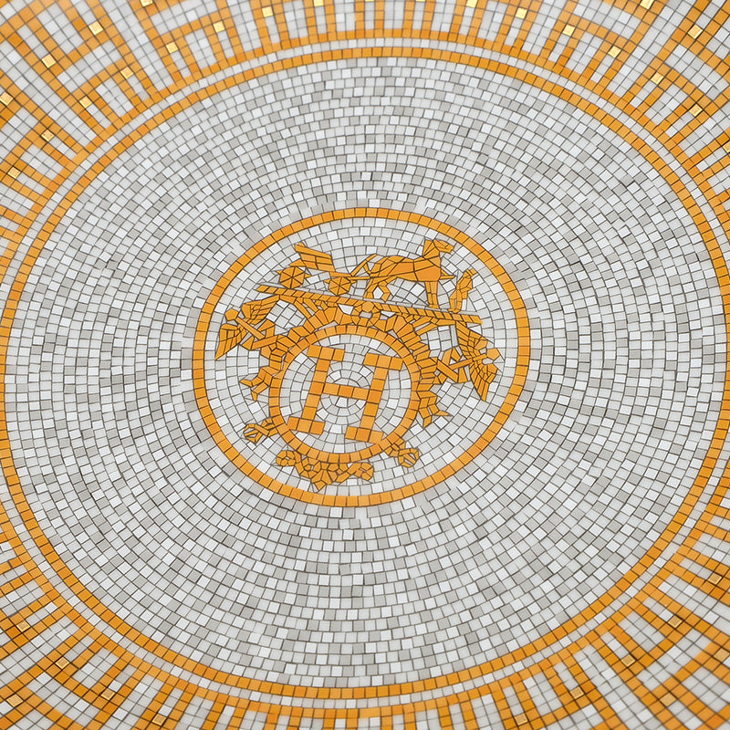 - パリのフォーブル・サントノーレ店にあるモザイクのフロアからインスピレーションを得た、幾何学模様が特徴のプレート皿です。上品なゴールドのラインと繊細なデザインが、タルトやケーキを美しく引き立て、食卓に洗練された華やかさを添えます。日常使いから特別な日のデザートプレートとしても活躍する、エルメスらしいエレガントな逸品です。