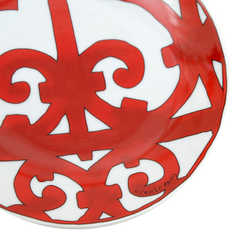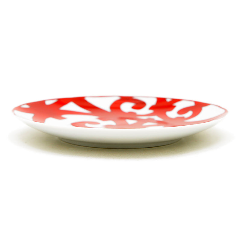 - スペインのコルドバ地方にあるセビリアの装飾的な鉄細工門からインスピレーションを得た、大胆で情熱的な赤と白のデザインが特徴のデザートプレートです。複雑に絡み合うアラベスク模様が食卓に華やかさとエキゾチックな雰囲気を添え、デザートだけでなく取り皿としても活躍する、芸術的な逸品です。