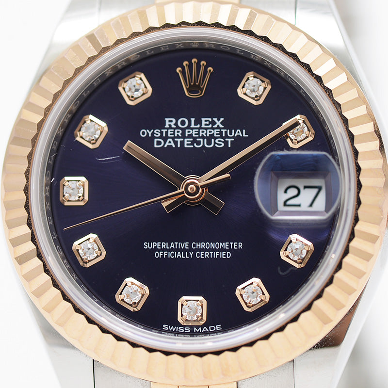 紫の深いニュアンスが豊かなサンレイ仕上げダイヤルとダイヤモンドインデックスが調和し、エバーローズゴールドとのコンビで上品かつ華やかな輝きを放ちます。手首の動きに応じて表情を変える光沢が魅力です。
