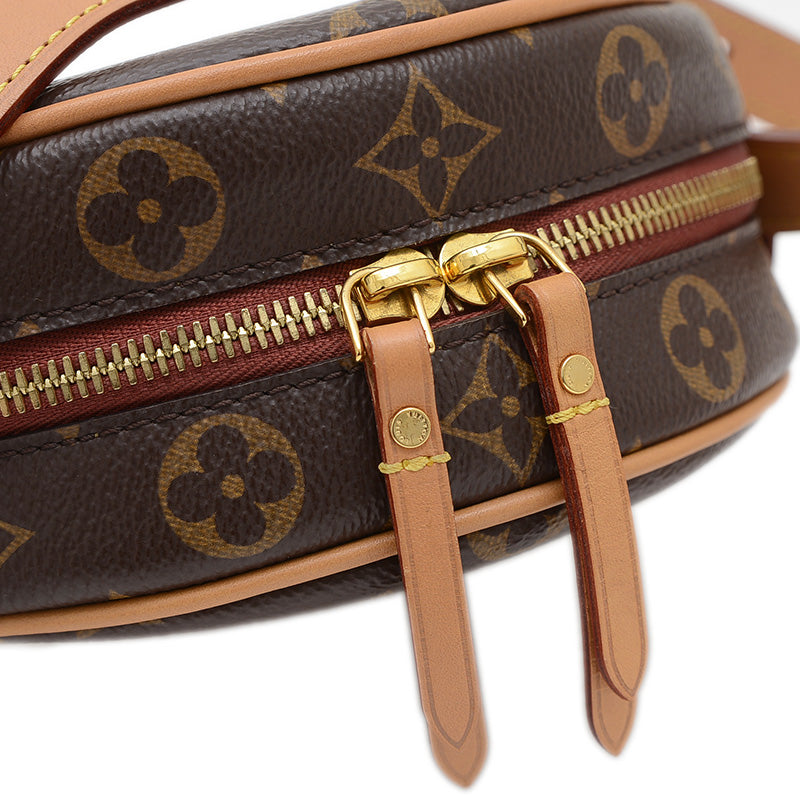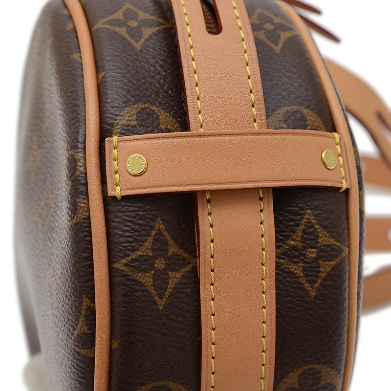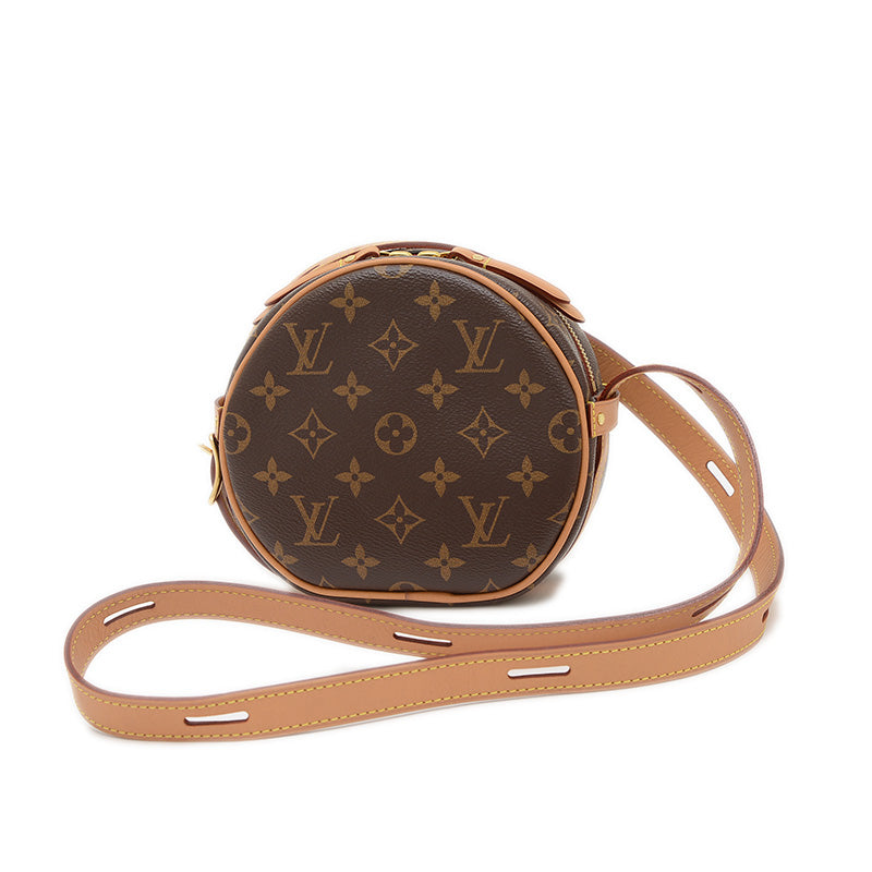 クラシックな帽子箱をモチーフにしたラウンド型のショルダーバッグです。モノグラム・キャンバスとレザーの組み合わせが上品で、コンパクトながらも必要なアイテムを収納できる実用性を備えています。