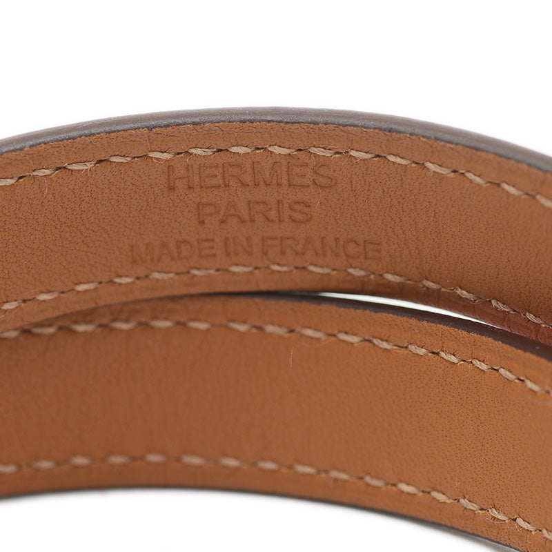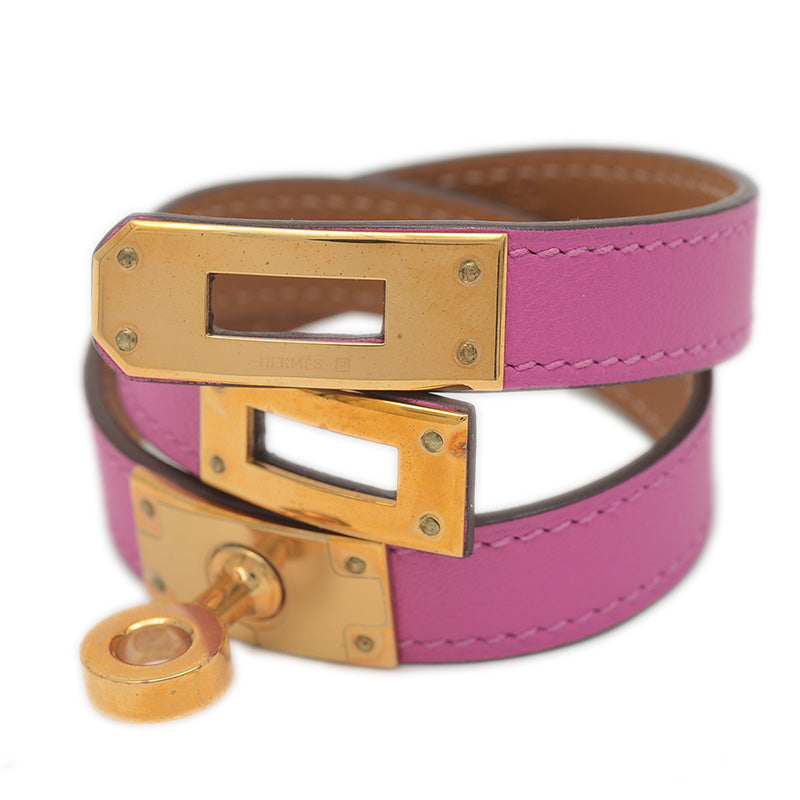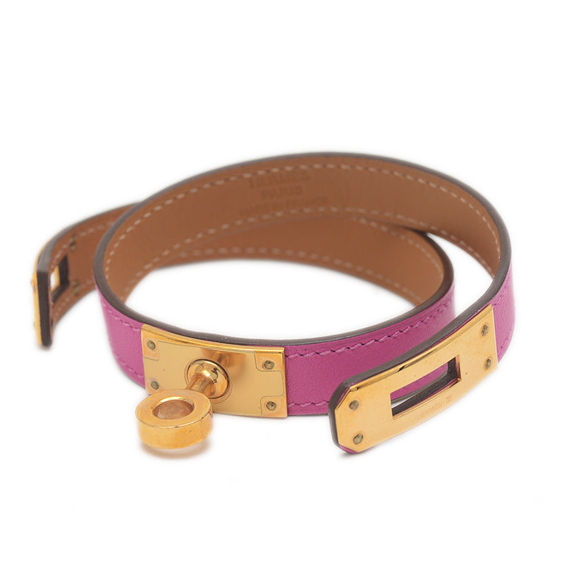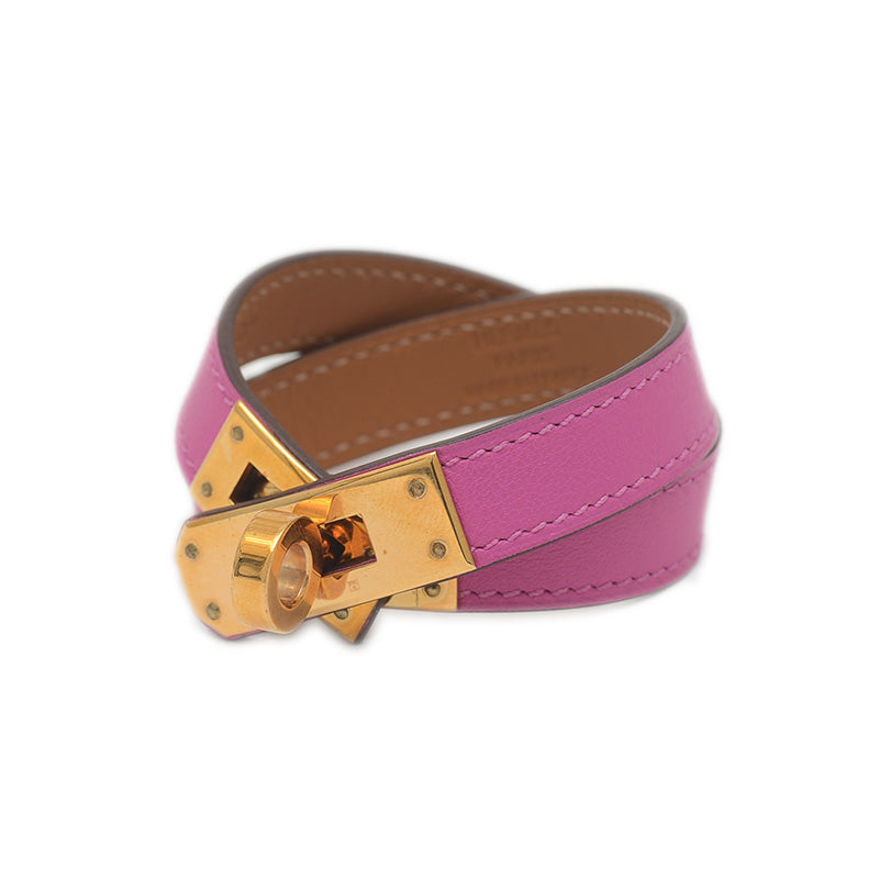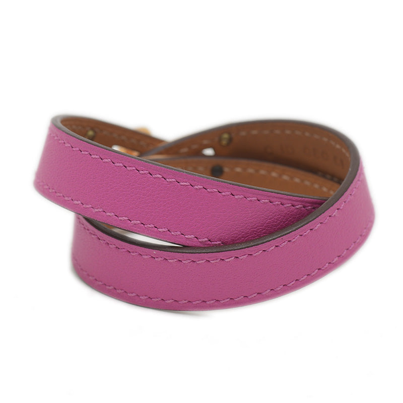 ケリーバッグのアイコニックな金具をモチーフにした、二重巻き(ドゥブルトゥール)のデザインが特徴です。しなやかなスイフトレザーの愛らしいマグノリア(ピンク)カラーが手首にフェミニンな彩りを添え、さりげなくエレガンスを演出します。
