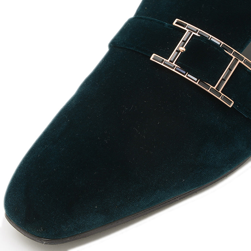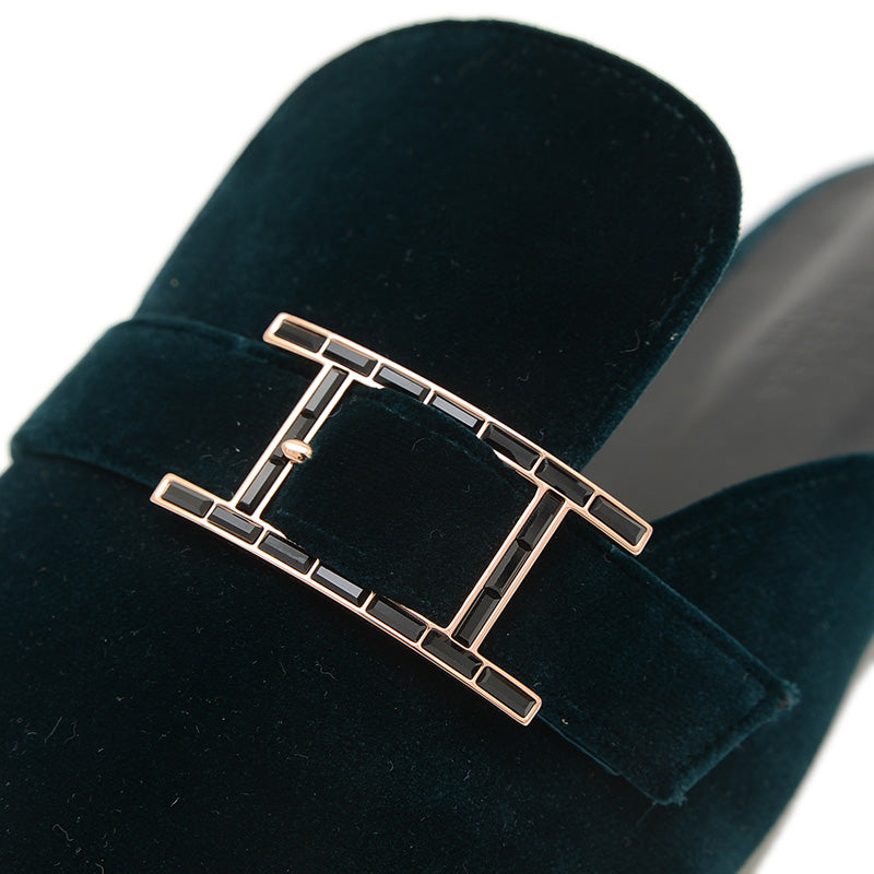 - 上質なヴェロア素材の鮮やかなグリーンカラーが目を引くミュールです。アイコニックなシェーヌダンクルのチェーンが甲部分にあしらわれ、さりげなくエレガンスをプラスしています。安定感のあるヒールと快適な履き心地は、日常使いから特別な日まで幅広く活躍する、洗練された一足です。