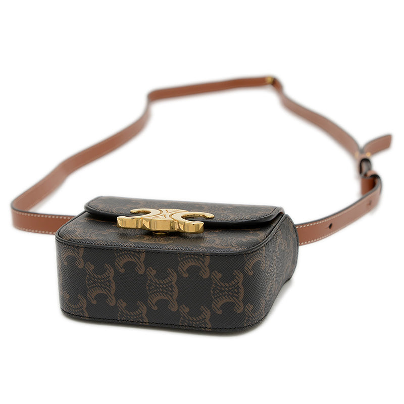 - 上質なカーフスキンの落ち着いたタンカラーと、ゴールドのトリオンフ金具が特徴のミニバッグです。クラシカルなスクエアフォルムと、チェーンストラップがエレガントなアクセントになっています。コンパクトながらも日常の必需品をスマートに収納でき、どんな装いも上品に格上げする人気の逸品です。