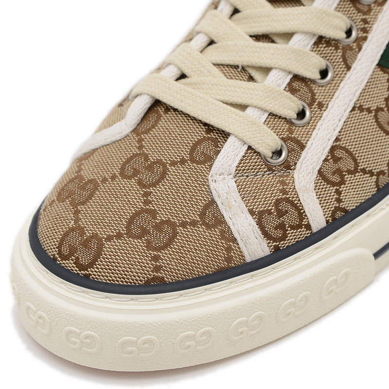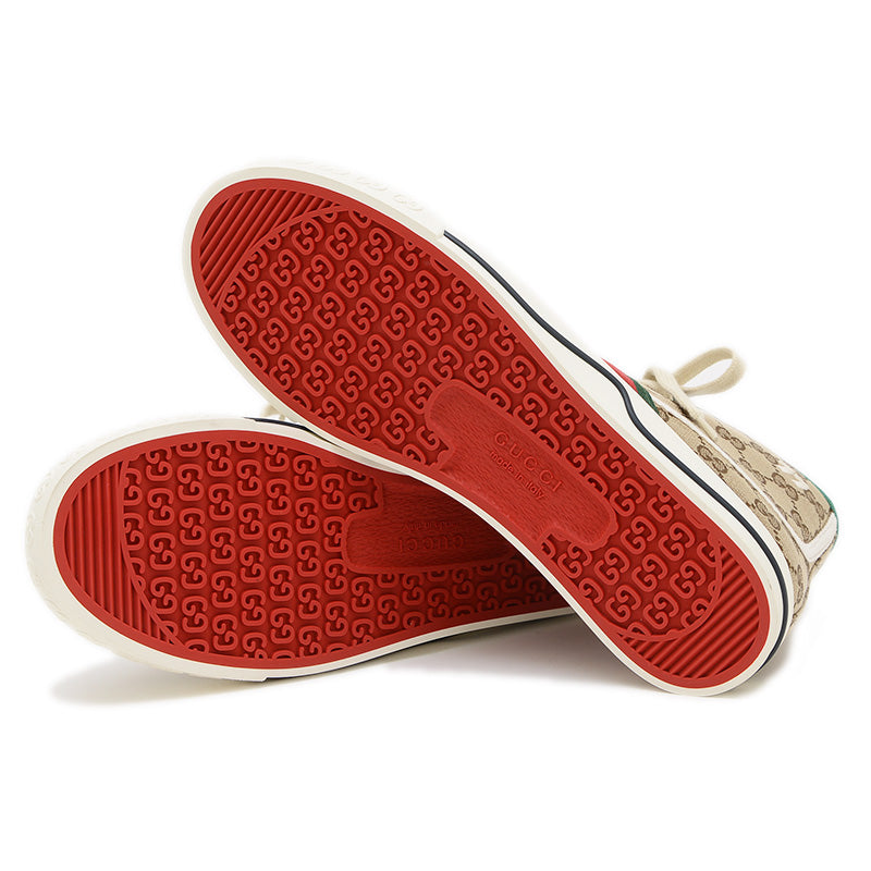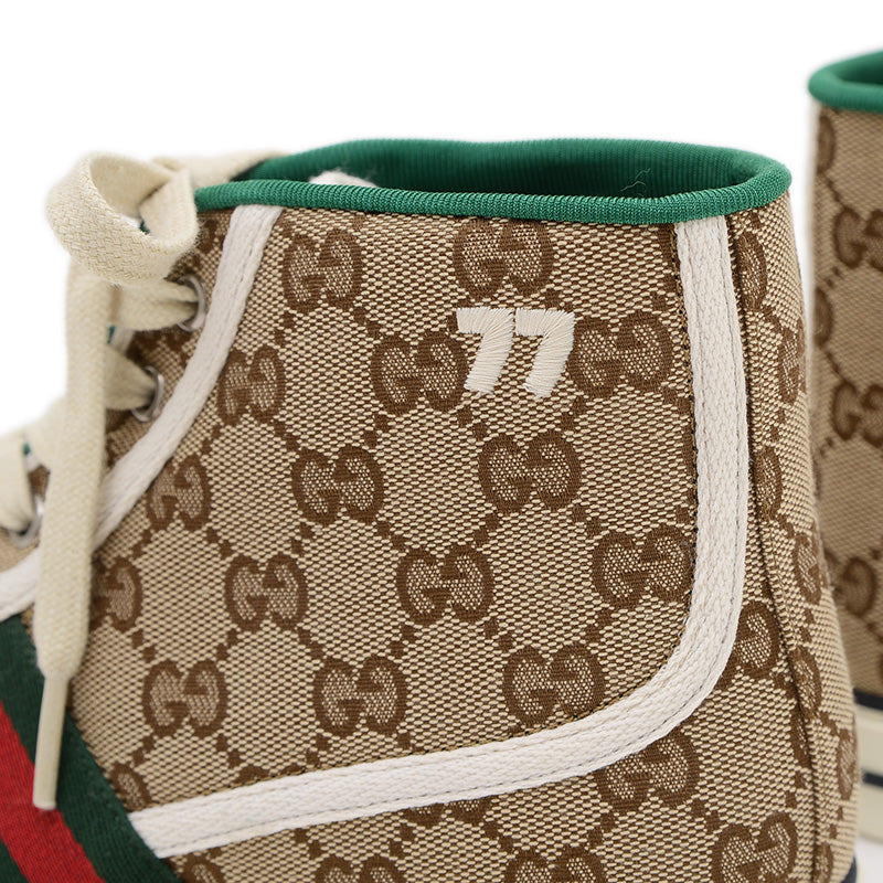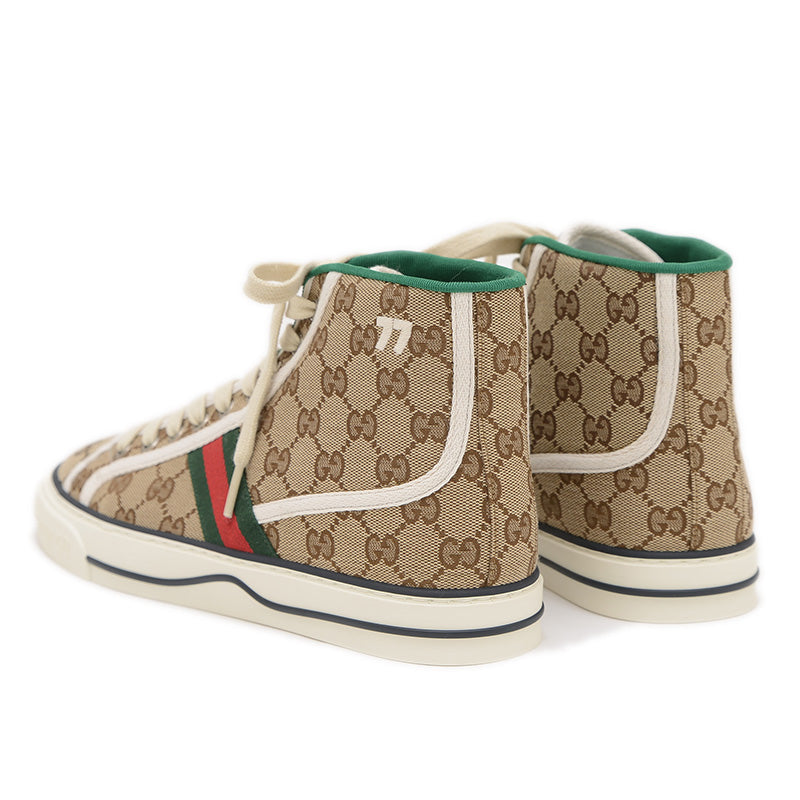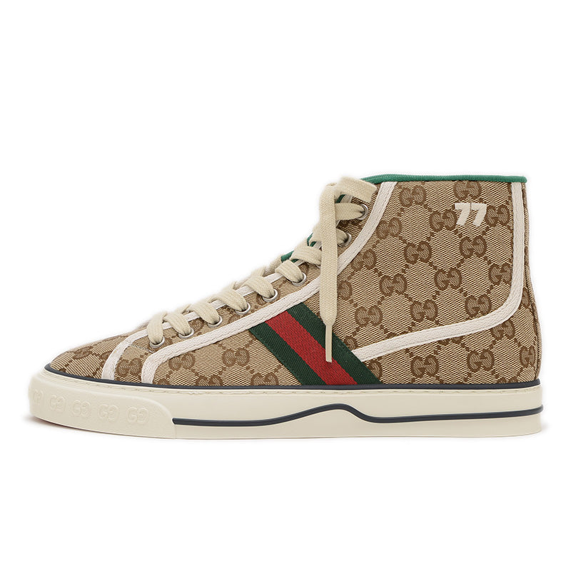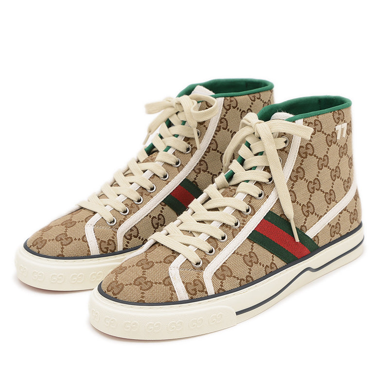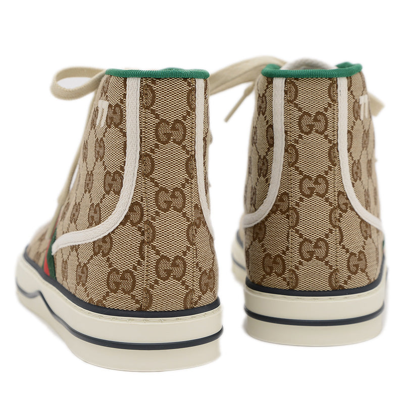 - ヴィンテージのテニスシューズから着想を得た、レトロなデザインが特徴のスニーカーです。クラシックなベージュのキャンバス素材に、グッチの象徴であるウェブストライプが施されており、ハイカットのフォルムが足元をスタイリッシュに演出します。カジュアルな装いを上品に格上げする、タイムレスな魅力を持つ一足です。