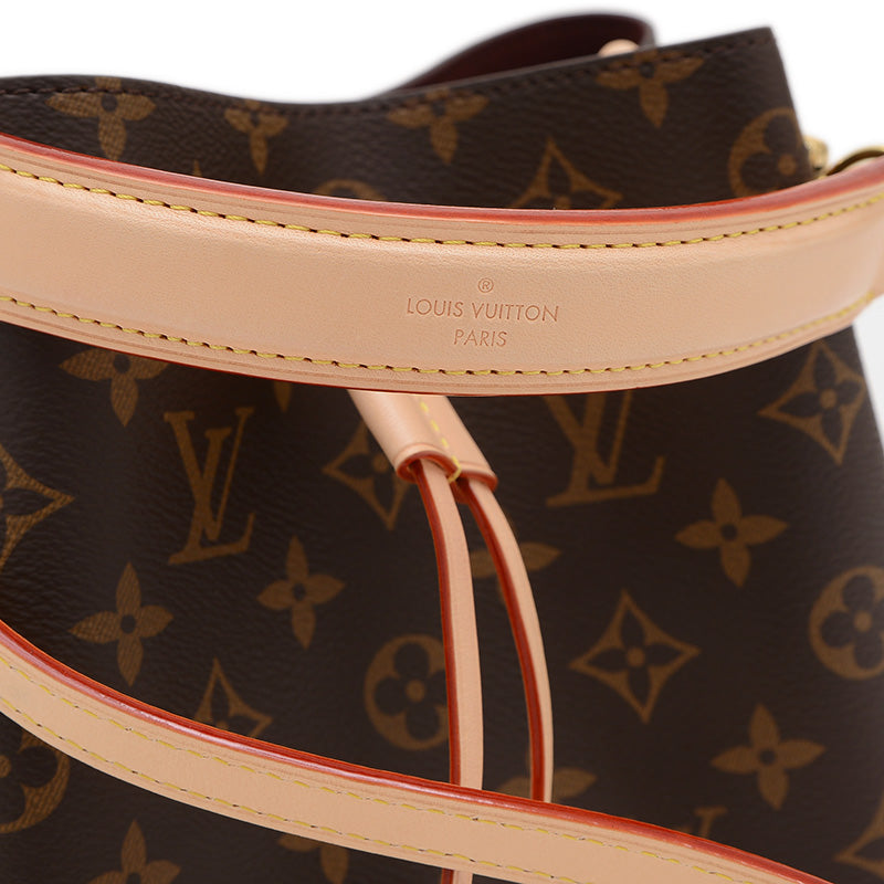 モノグラムキャンバスとヌメ革トリムが上品なクラシック感を演出。巾着式開閉+調節・取外し可能な2WAYストラップでハンドからショルダーまで使い分け可。