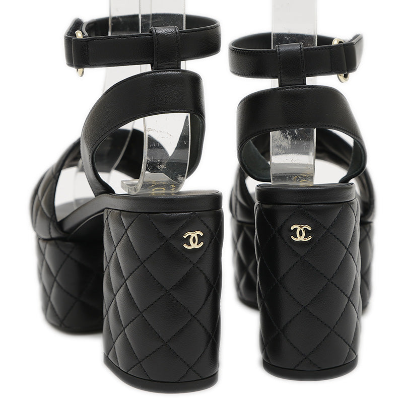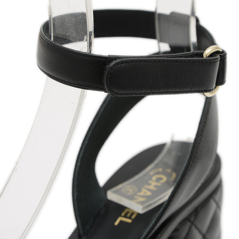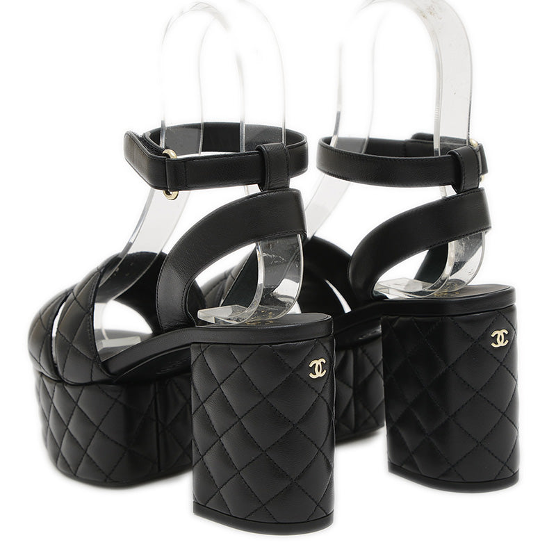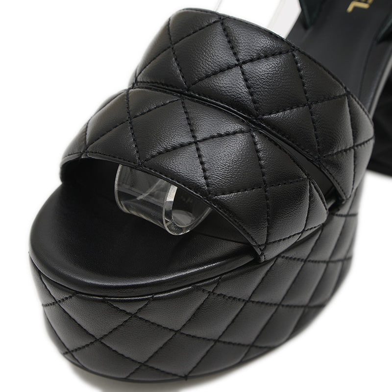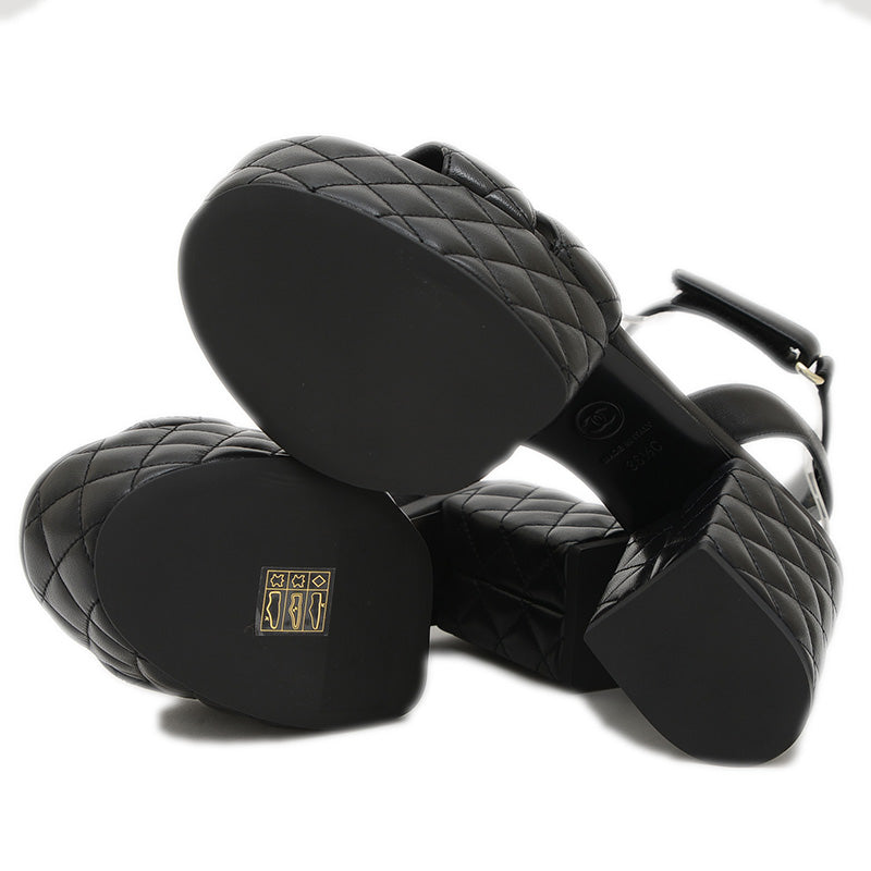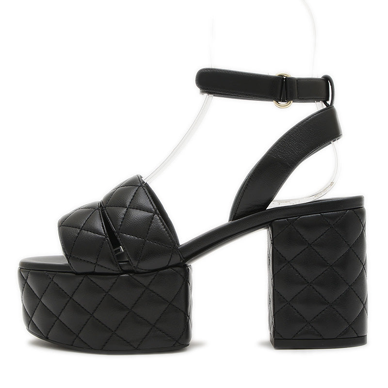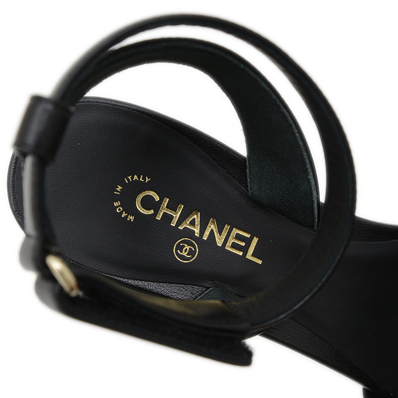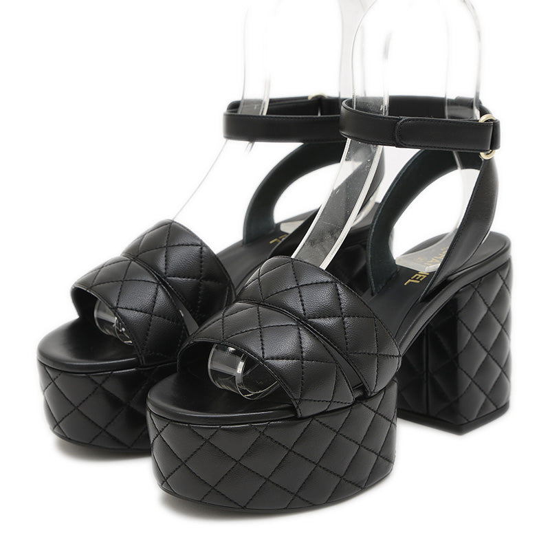 - ふっくらとしたキルティングが施された上質なラムスキン素材のブラックカラーが特徴のサンダルです。ゴールドまたはシルバーのチェーンがストラップにあしらわれ、シャネルらしいエレガントなアクセントを添えます。安定感のあるチャンキーヒールで歩きやすく、カジュアルからきれいめまで幅広いスタイルを上品に格上げする人気の逸品です。