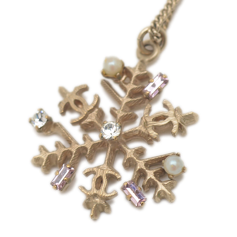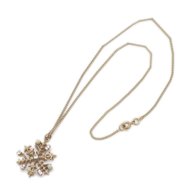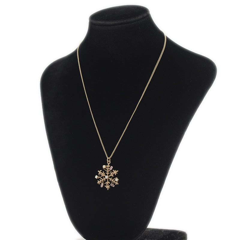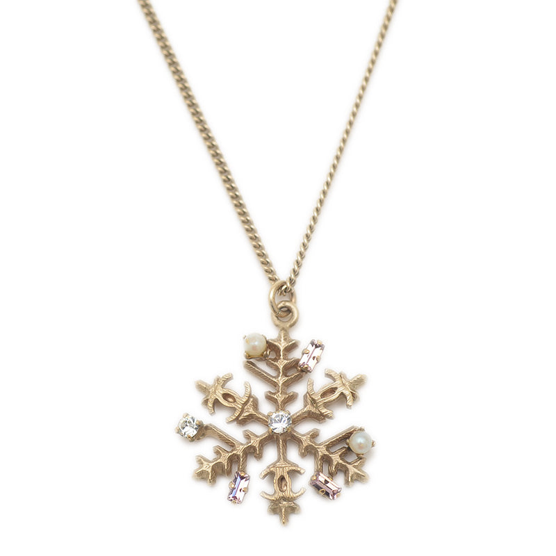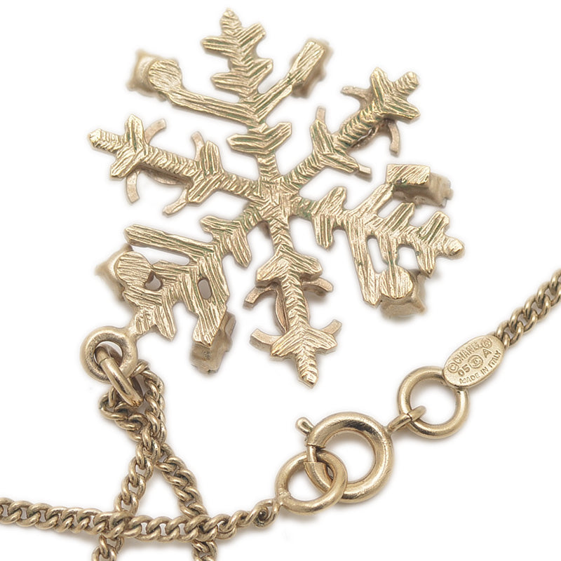 - 雪の結晶をモチーフにした、繊細でロマンティックなデザインが特徴です。光沢のあるゴールドカラーのメタルに、きらめくラインストーンが贅沢にあしらわれ、胸元で上品な輝きを放ちます。冬の装いはもちろん、どんなスタイルにもエレガントな華やかさを添える、人気の高いアクセサリーです。