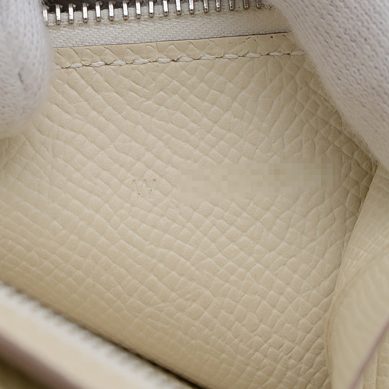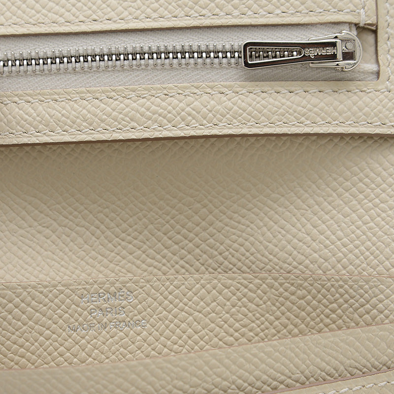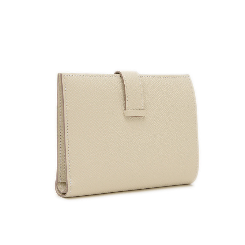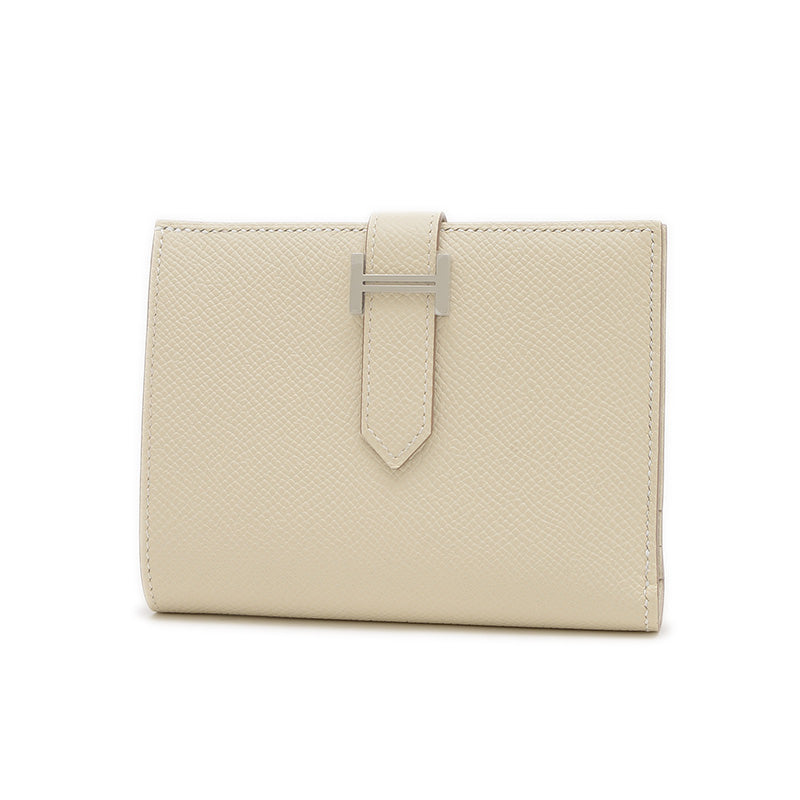 コンパクトながらも収納力と機能性を兼ね備えた二つ折り財布です。傷に強く型崩れしにくいヴォー・エプソン素材の上品なクレ(淡いオフホワイト)カラーに、クールなシルバーのH金具が洗練されたアクセントになっています。内側には札入れ、小銭入れ、複数のカードスロットを備え、日常使いに最適なエレガントな逸品です。